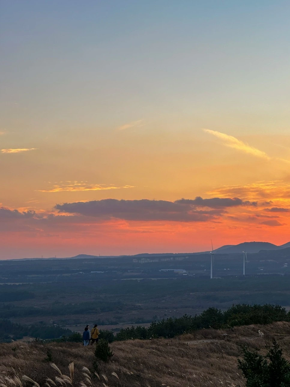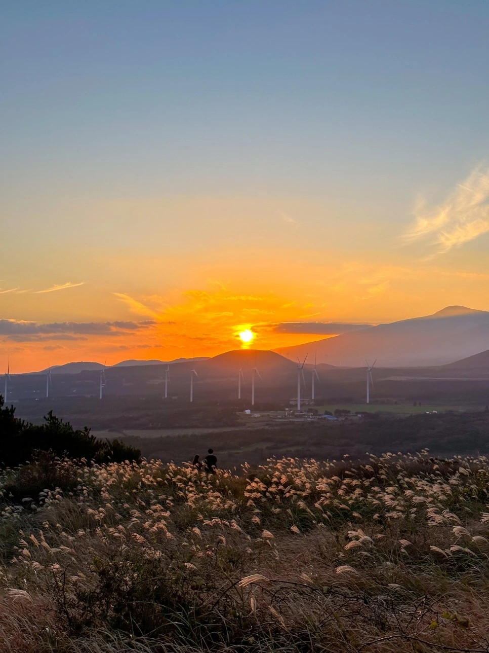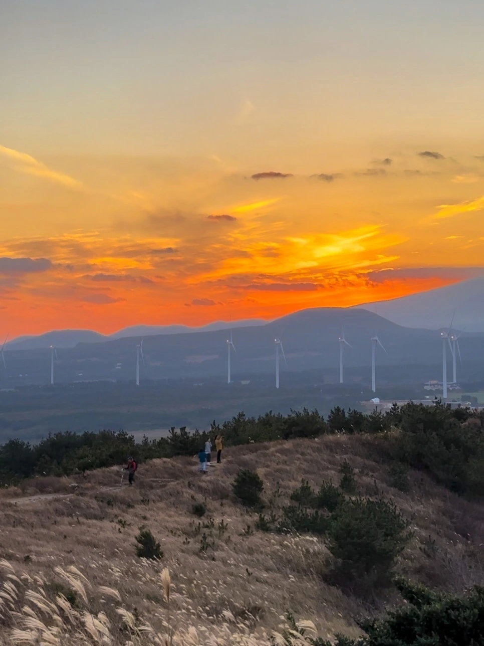 해가 지는 풍경과 한라산을 함께 볼 수 있는 곳은 오름중에서도 따라비오름이 유일무이하다. 말 그대로 붉은 노을이다. 억새들과 풍차, 그리고 한라산까지. 제주도에서 느낄 수 있는 모든 풍경과 함께 일몰을 볼 수 있다는 것 자체가 놀랍지 않은가.