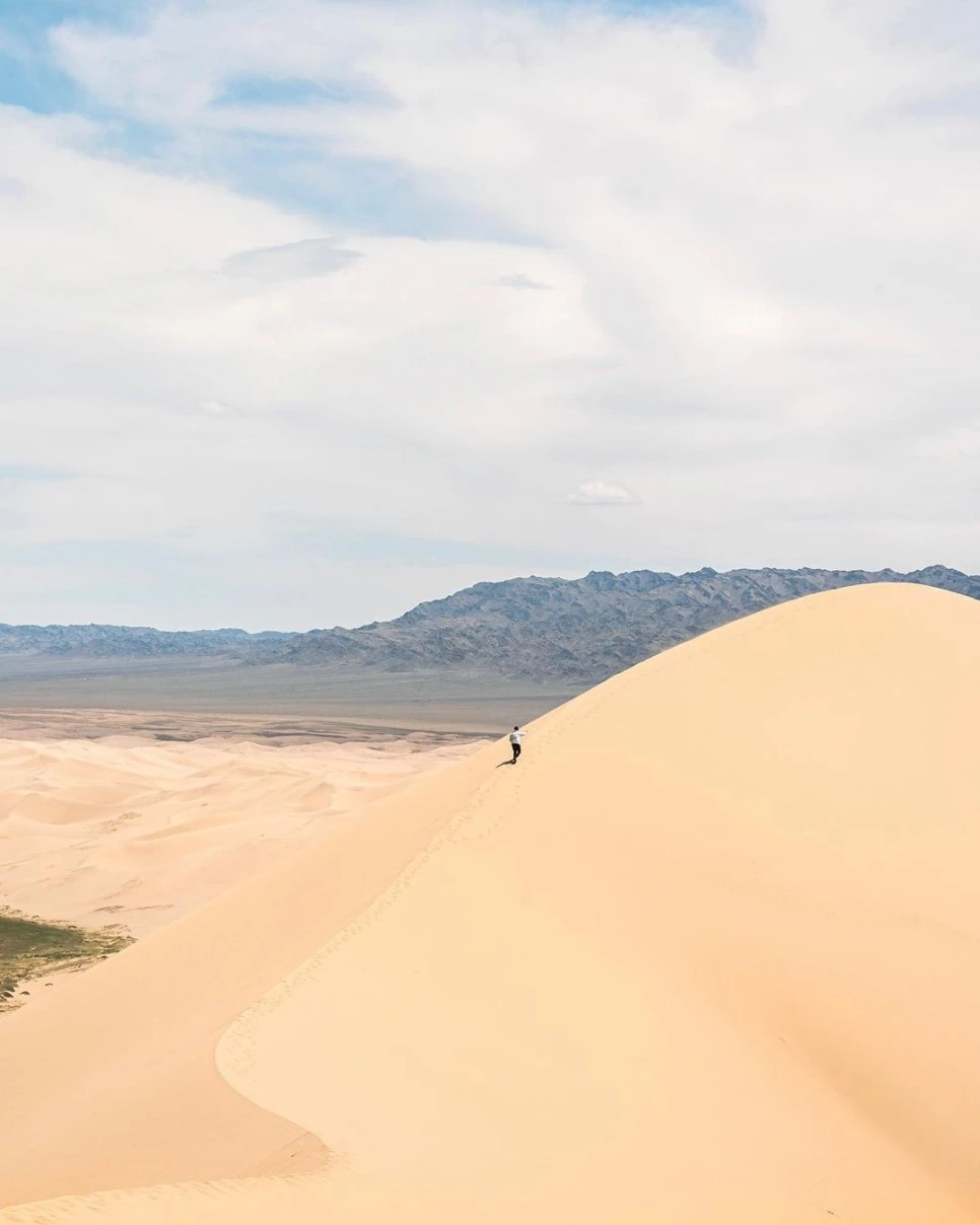 8월의 몽골의 기온은 한국의 초봄과 비슷하다. 최근 여행객들에게 인기 있는 스팟은 고비사막. 거대하고 부드러운 모래성처럼 보이지만 제법 바람도 많이 불고 경사도 심해 등반이 쉽지만은 않다. 하지만 움푹 움푹 발자국을 남기며 걷는 재미가 있고, 경사를 따라 샌드 보드를 타는 등 다양한 방법으로 즐길 수 있어 매력적이다.