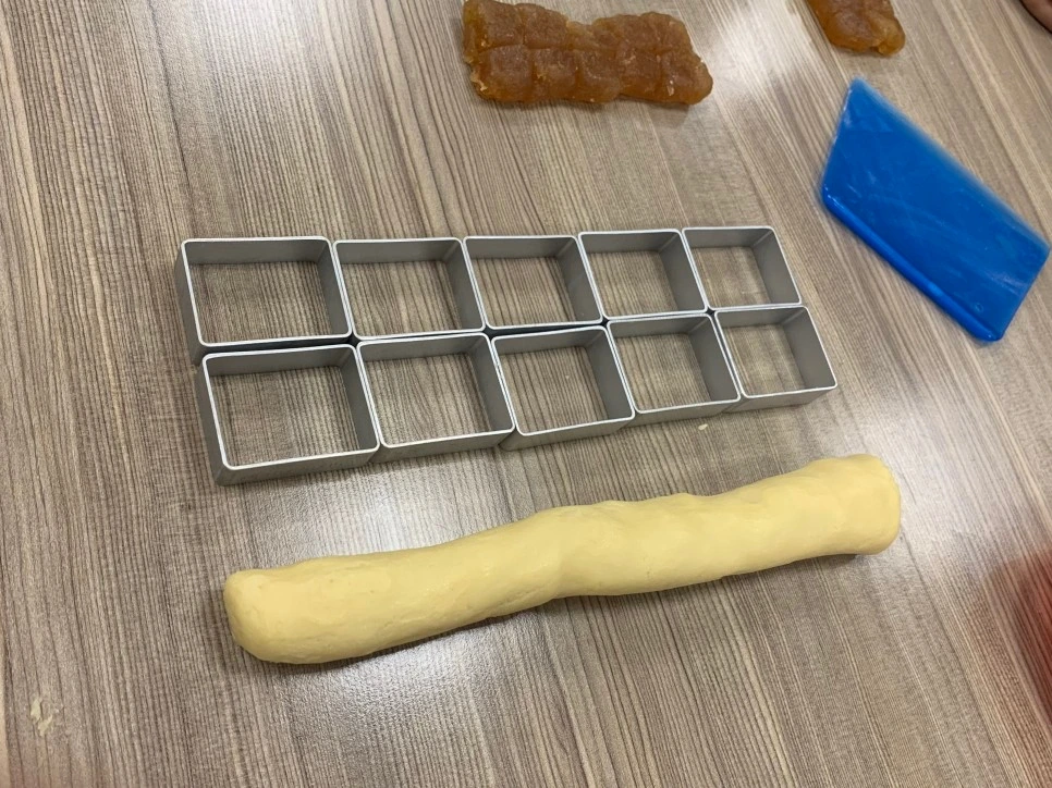오늘 체험에서는 1인당 10개의 펑리수를 만들게 된다. 각각 10개의 펑리수 틀을 가져가 앞에 놓고, 반죽을 비슷한 길이로 늘려준 다음, 동그란 반죽 열 개를 만들어 낸다.
