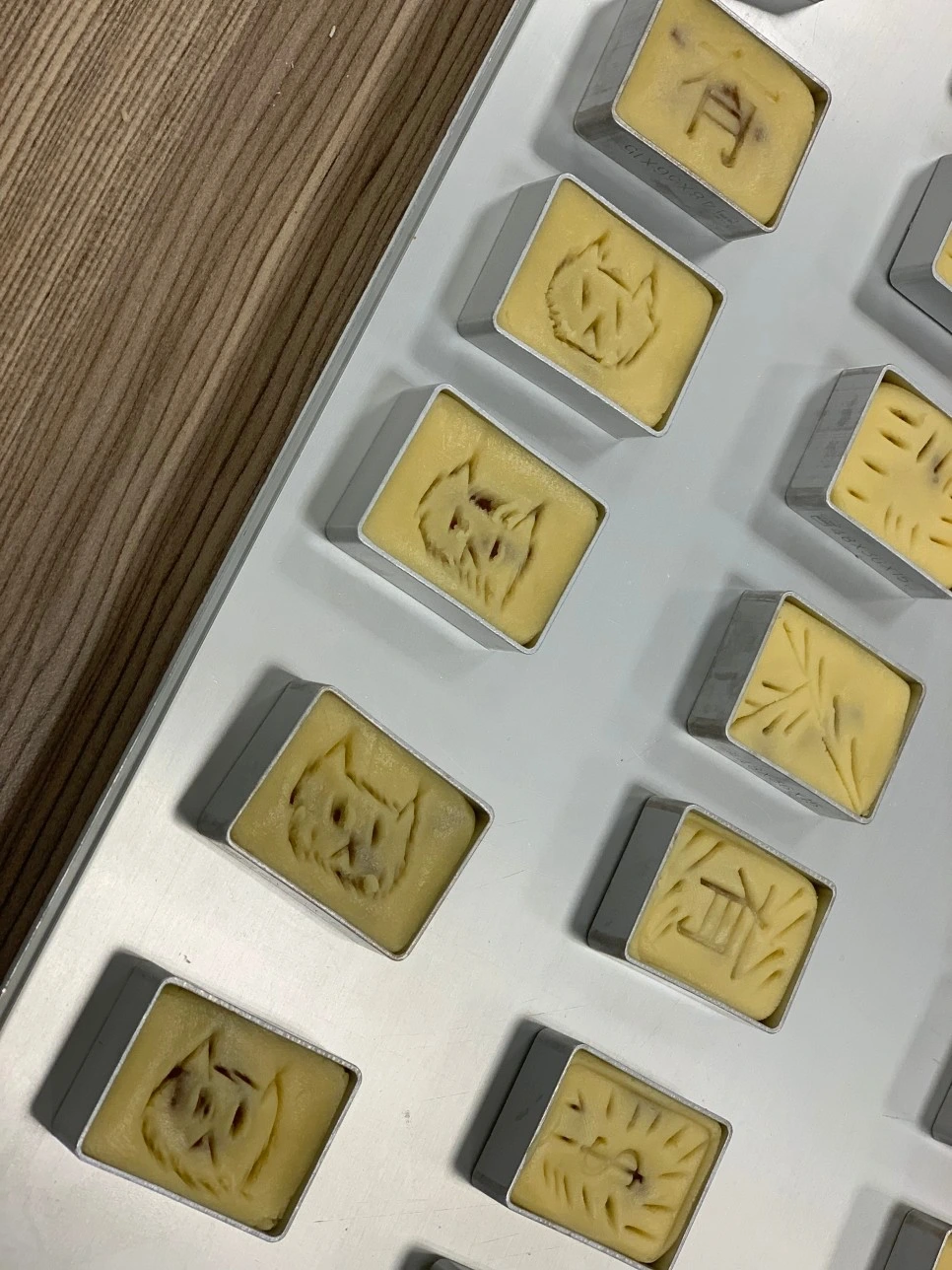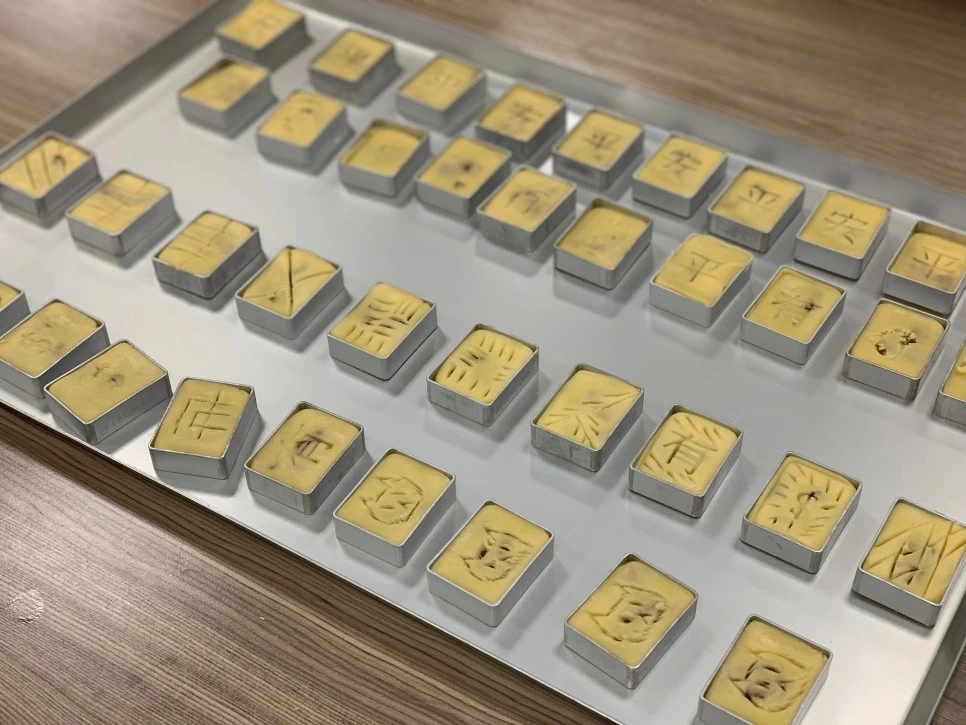 틀에 꼭 맞게 펑리수 반죽이 만들어졌으면, 이곳에 원하는 그림이나 글자를 조각해 넣거나 준비된 모양 도장으로 꾹 눌러 나만의 펑리수를 만들면 된다.