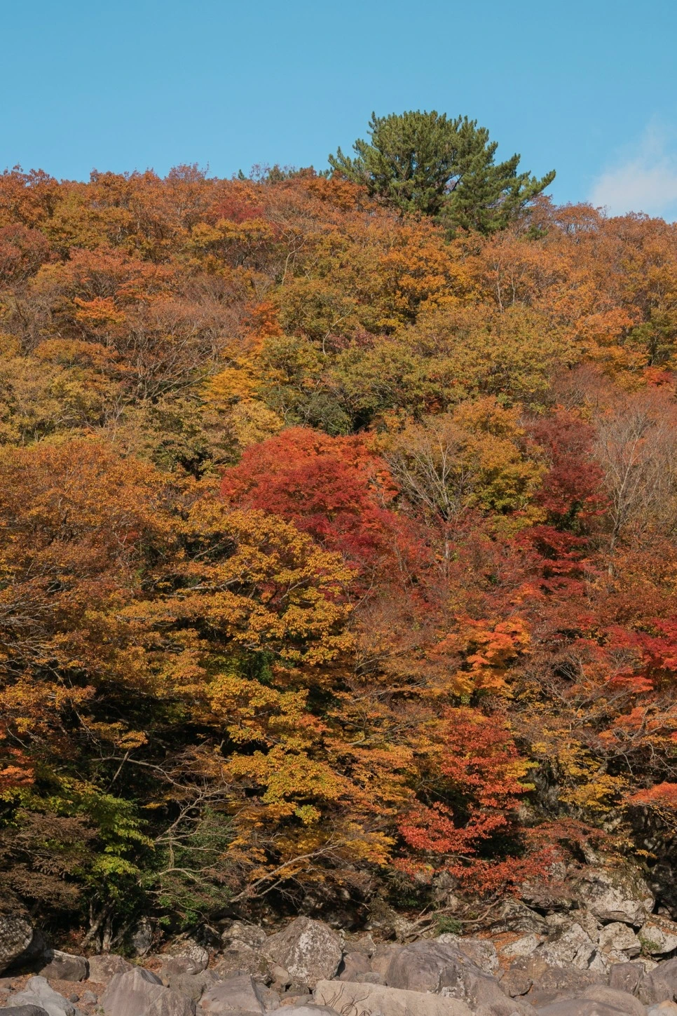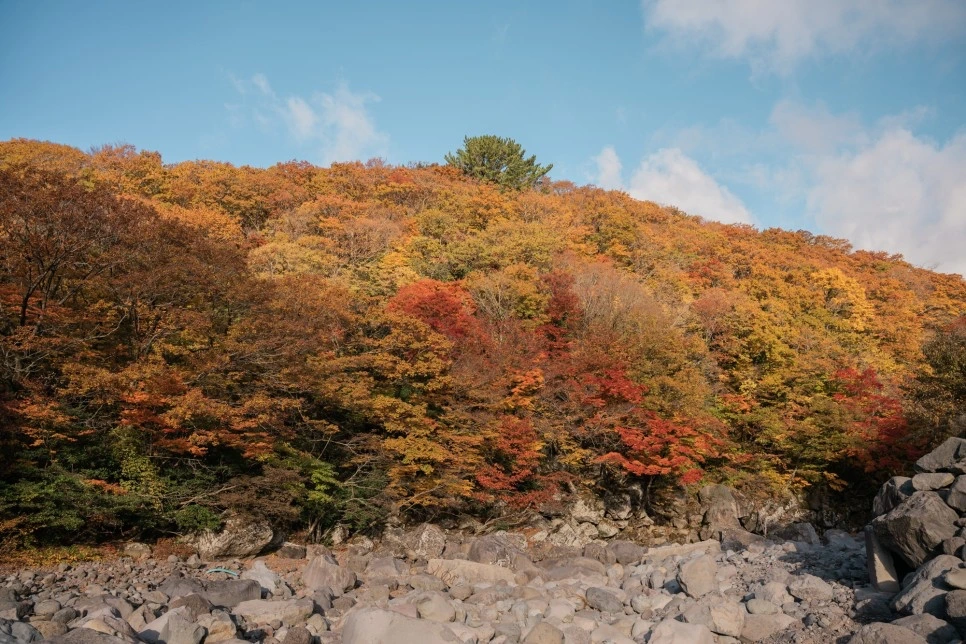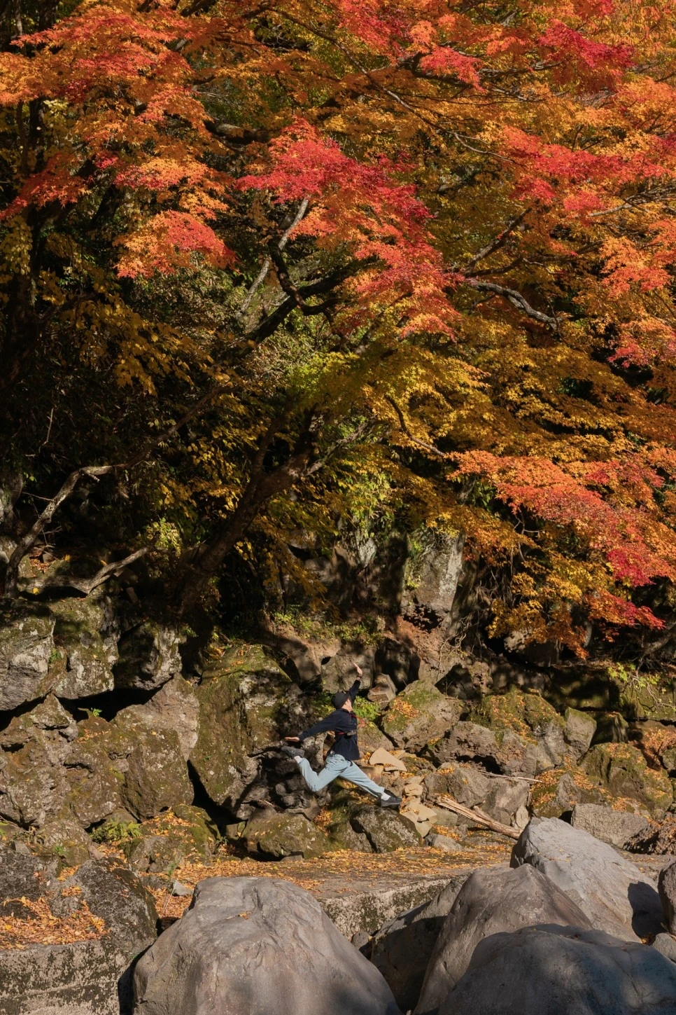 천아계곡 주차장에서 내려와 왼쪽 방향으로 조금만 올라가면 천아계곡의 웅장한 단풍을 배경으로 인생샷을 남길 수 있다. 바위에 올라 한라산 아래에 펼쳐지는 제주 단풍을 바라보며 사진도 찍고, 눈으로도 담아보자.