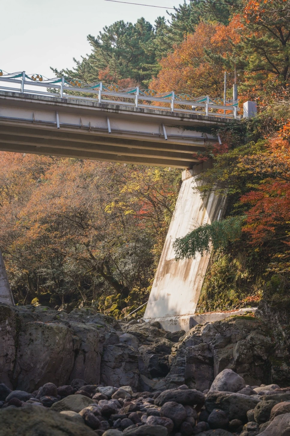 다리 아래로 들어오는 햇살에 비치는 단풍잎부터 바닥에 떨어진 낙엽까지. 시선 닿는 곳 하나하나 가을을 즐기기 너무 좋은 스팟이다. 천아계곡과 탐라교육원 단풍 구경을 간다면 운동화나 스니커즈를 신고 방문하자. 돌밭을 걸어 다녀야 하기 때문에 구두나 힐은 위험하다.