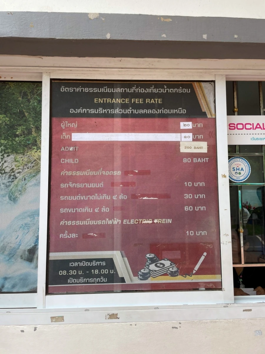 핫스프링 입구에 비치된 가격표다. 핫스프링 역시 태국 국립공원으로 지정돼 입장료가 있다. 성인 기준 200바트이며, 약 7,200원의 가격이라고 생각하면 된다.