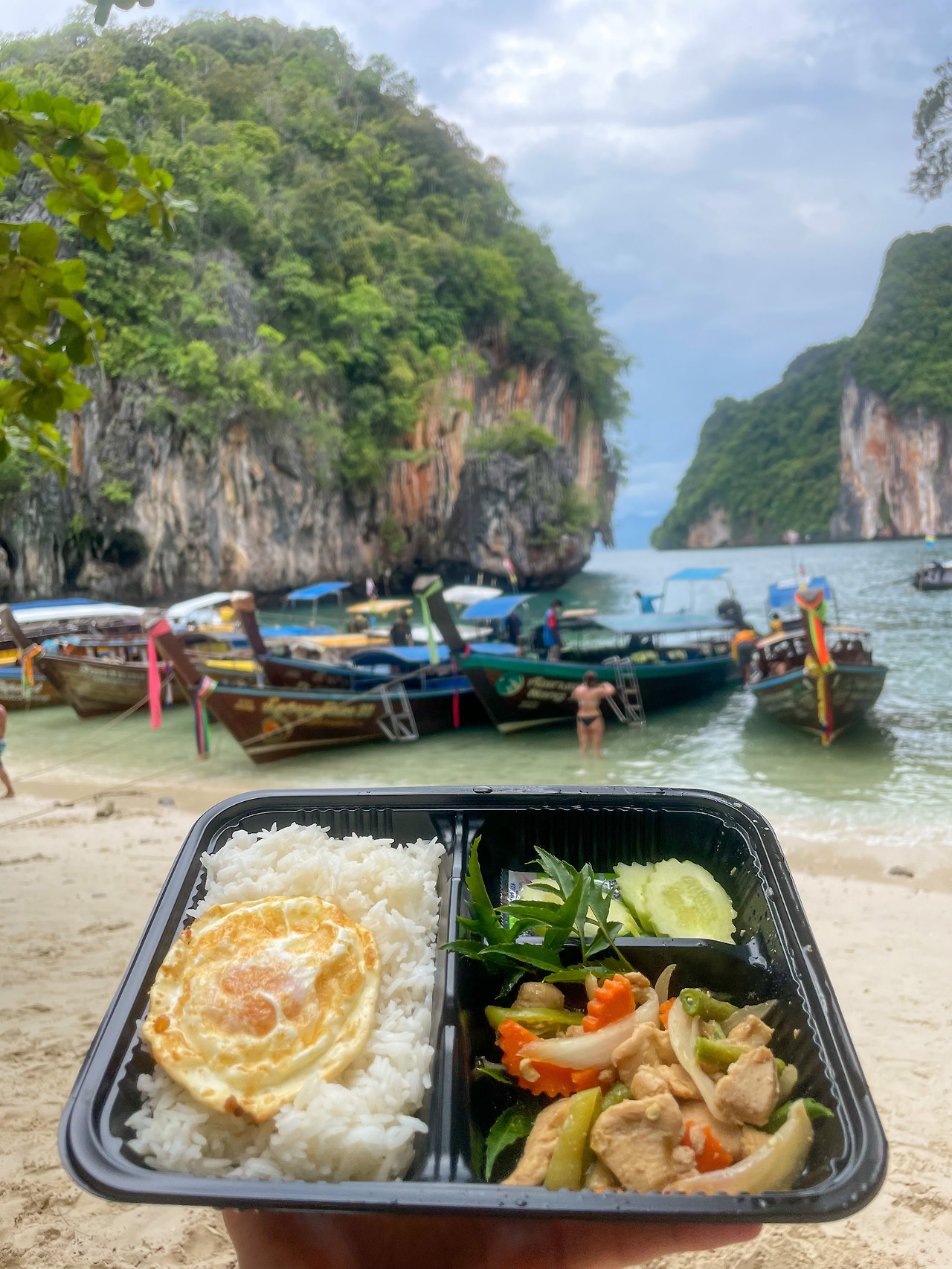 홍섬투어에는 점심 식사가 포함되어 있어 간단한 태국식 도시락이 준비된다. 식당에서 먹는 메뉴만큼 화려하고 맛있지는 않지만, 물놀이 후에 먹는 밥이기에 허기진 배를 채울 수 있다.