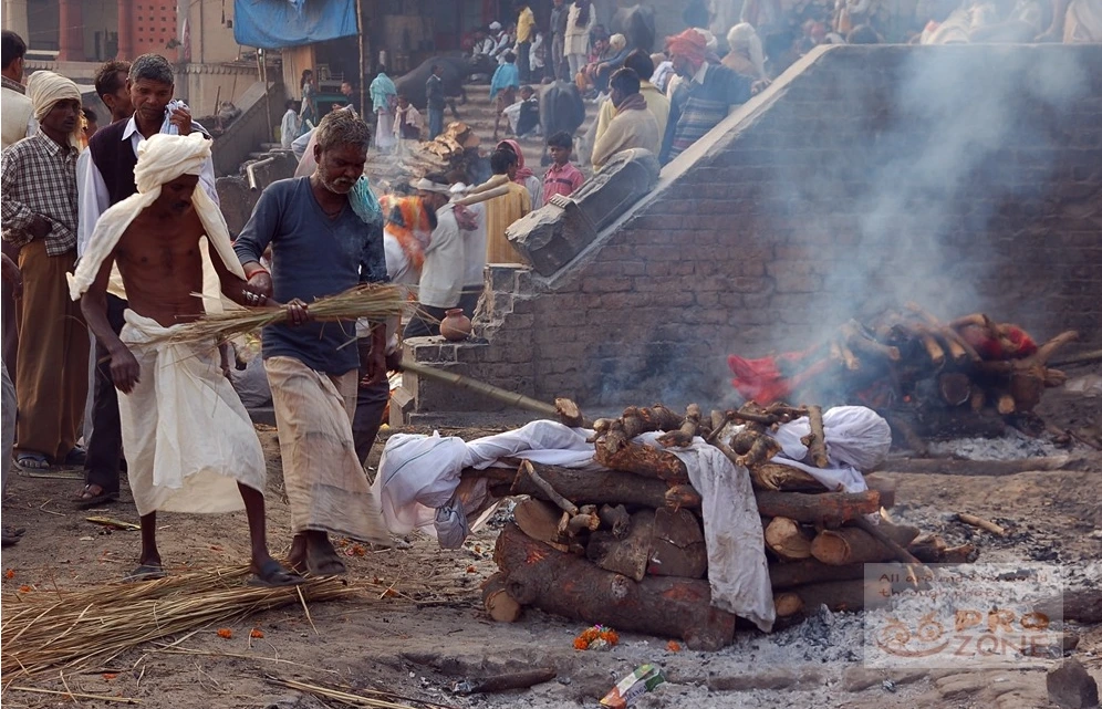 사망 당일에 운반되어 온 시신은 시바신을 모신 타라게슈와르 사원에 우선 안치된다. 시바신이 죽은 자의 귀에 타라카 만트라 (구재의 진언)를 속삭이면 생전엔 아무리 큰 죄를 지은 사람도 해탈할 수 있다고 한다. 천으로 싼 대나무 들것에 운반되어 온 시신은 황금색(여자는 붉은색) 천으로 싸여 화려한 꽃으로 장식한다. 4명의 사내들이 어깨 위로 시신을 들것에 받쳐 들고 강가에 이르면 그대로 강가에 적신 후 어느 정도 물이 빠지면 준비된 장작 위에 올려놓는다. 그러면 화장터를 어슬렁거리던 소와 염소들은 시신을 덮고 있던 꽃을 먹기 위해 느린 걸음으로 다가온다. 상을 당한 사람들은 정수리 부분에 동전만 한 크기의 머리카락만을 남기고 삭발을 하는데 삭발을 한 상주는 신성한 "소마풀"에 불을 붙여 장작더미를 빙 둘러 불을 놓는다. 불꽃을 접한 장작이 활활 타오르기 시작하면 시신을 덮고 있던 황금색 천이 먼저 타들어가고 서서히 망자의 몸이 드러난다. 망자는 불길이 이르는 대로 검은 연기와 매캐한 냄새를 허공에 남기며 3시간 동안 타들어 간다.