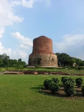 다멕 스투파 모뉴먼트 사이트 안으로 들어가면 제일 먼저 넓은 잔디밭 위에 우뚝 솟은 붉은 스투파가 눈에 들어온다. 6세기에 세워져 일부가 훼손되긴 했지만 직경 26m 높이 13m의 대좌 위에 약 31m의 탑이 세워져 있는데 진흙으로 만든 철옹성 같은 느낌이 들었다. 작은 참새가 두 팔을 벌리고 스투파를 안았지만 참새가 스투파를 안았다기보다 거대한 스투파에 참새가 안겨있는 것 같았다. 스투파는 붓다의 상징이고 붓다의 가르침의 상징이다.
