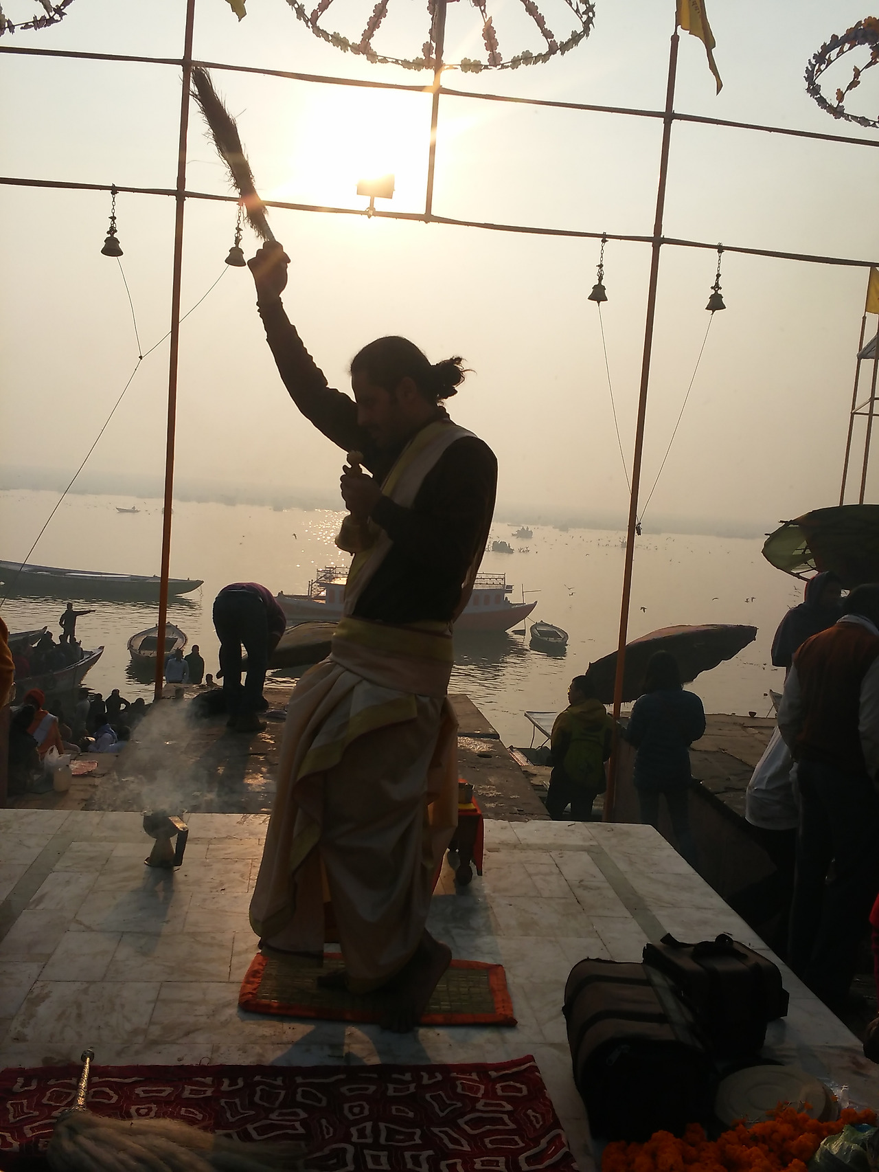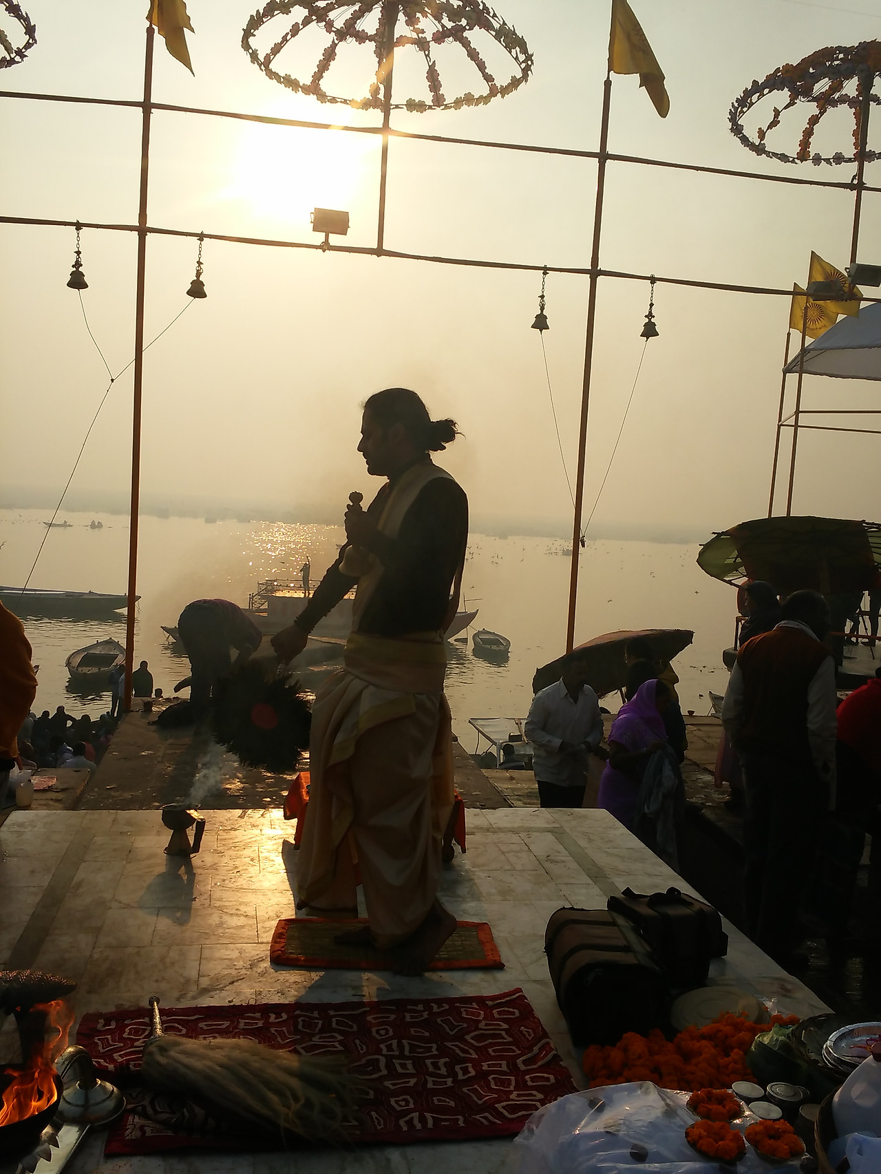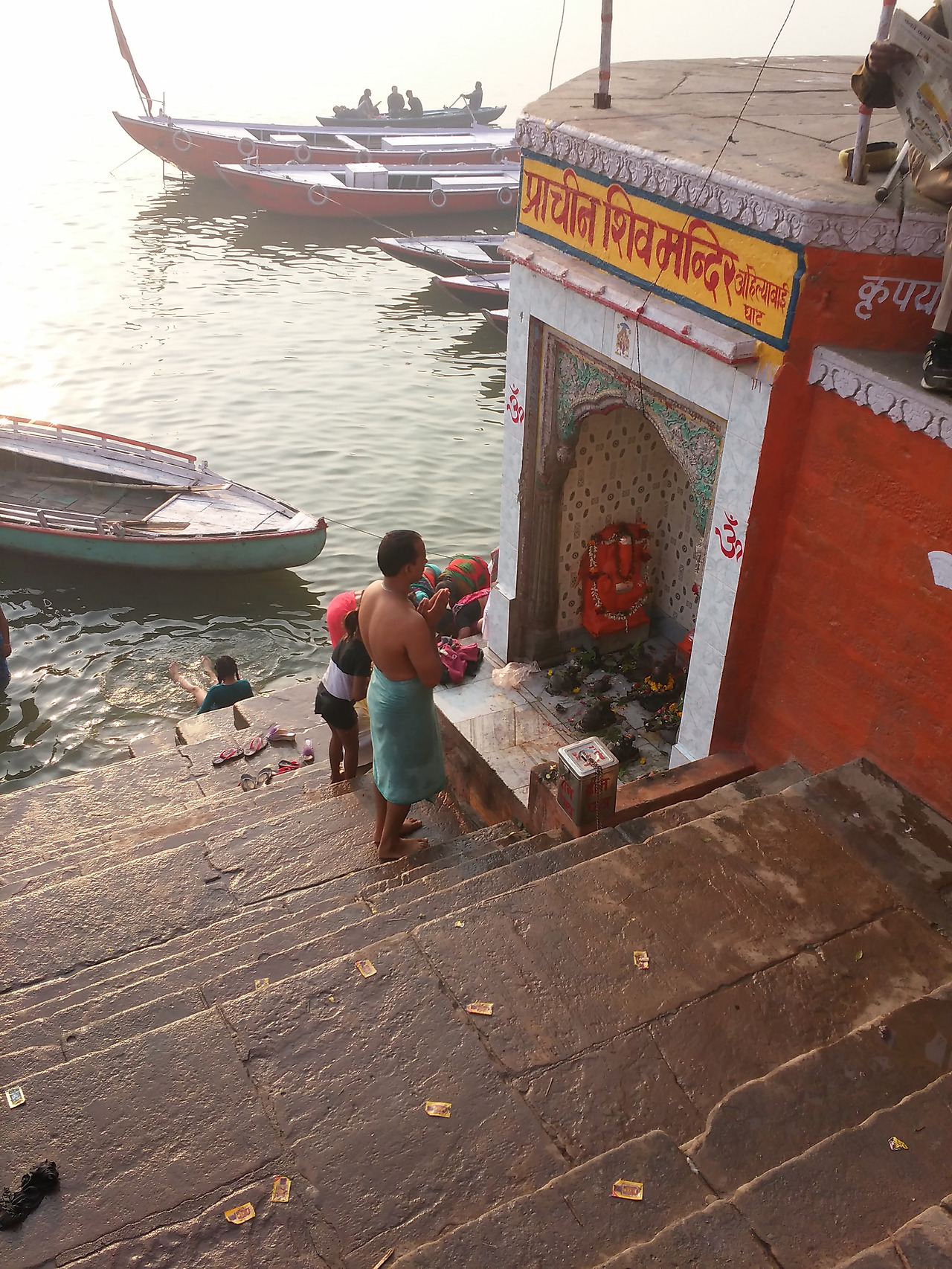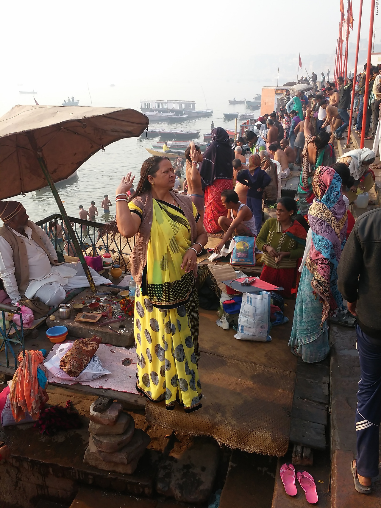 가트에는 축제를 즐기는 사람들이 가득했다. 메인 가트에는 경찰들이 나와 있었고 확성기에서는 소지품을 잘 관리하라는 방송이 반복적으로 나왔다. 어머니품에 안기려는 많은 사람들은 혼잡한 계단을 조심스럽게 내려가 강가에 몸을 담그고 젖은 몸을 말리느라 정신이 없었다. 전문 사진사들은 돈을 받고 어머니 품에 안긴 사람들을 사진기에 담고 그 자리에서 현상해 주었다. 활기 넘치는 사람들로 인해 살아있는 강가를 만난 것 같았다.