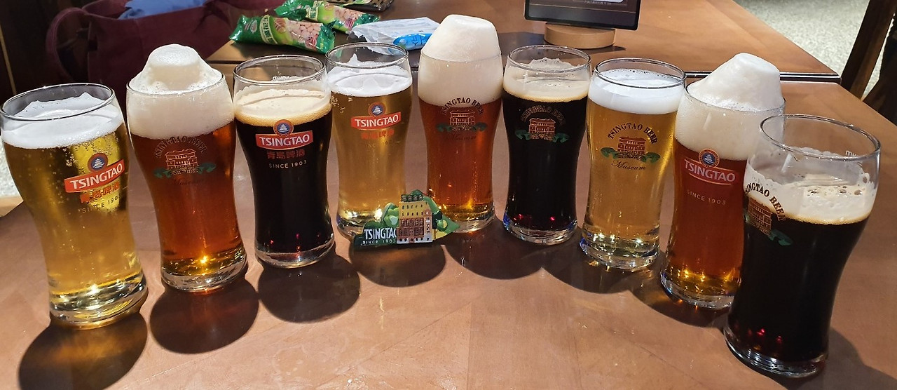 칭다오에서 마신 다양한 맥주. 위엔장 생맥주(왼쪽 상단)는 보통의 라거와 비교해 더 노랗고 불투명해 마치 바이젠 같은 느낌이다.