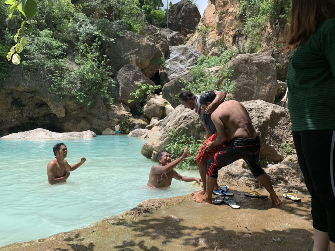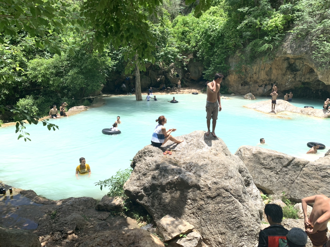 우리들은 모두 사는 곳은 다르지만 미얀마의 보석 같은 이 블루라군 "디독폭포"를 보기 위해 멀리서 왔다. 만달레이에서 디독폭포까지 약 1시간 30분 정도가 걸렸고 비포장도로가 많아서 약간의 멀미도 했다. 디독폭포로 가는 산 입구에 도착해서 또다시 30분가량 등산을 해야 했다. 샌들로 올라가기는 너무 자잘 자잘한 돌도 많고 산길이 가파라서 등산화를 신고 올라갔다. 등산화를 신었음에도 미끄러웠다. 내 옷이 땀에 흠뻑 젖었을 때쯤 디독폭포의 모습이 보였다. 그때의 행복감은 이루 말할 수가 없을 것 같다. 때 마침 선선한 바람이 불어옴과 동시에 젖은 내 옷을 말려주었고, 뜨거웠던 햇살은 따뜻한 햇살로 바뀌어 디독폭포를 아름답게 비추고 있는 것 같았다.
