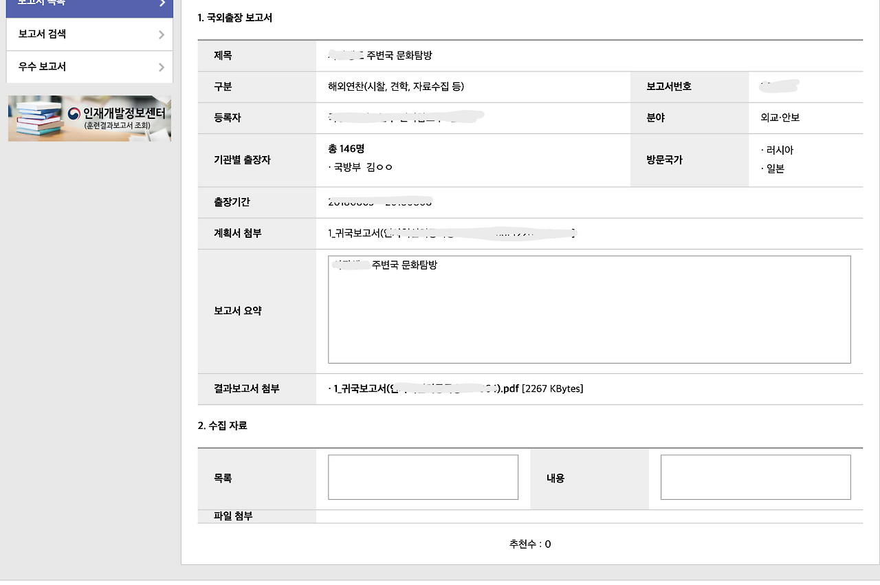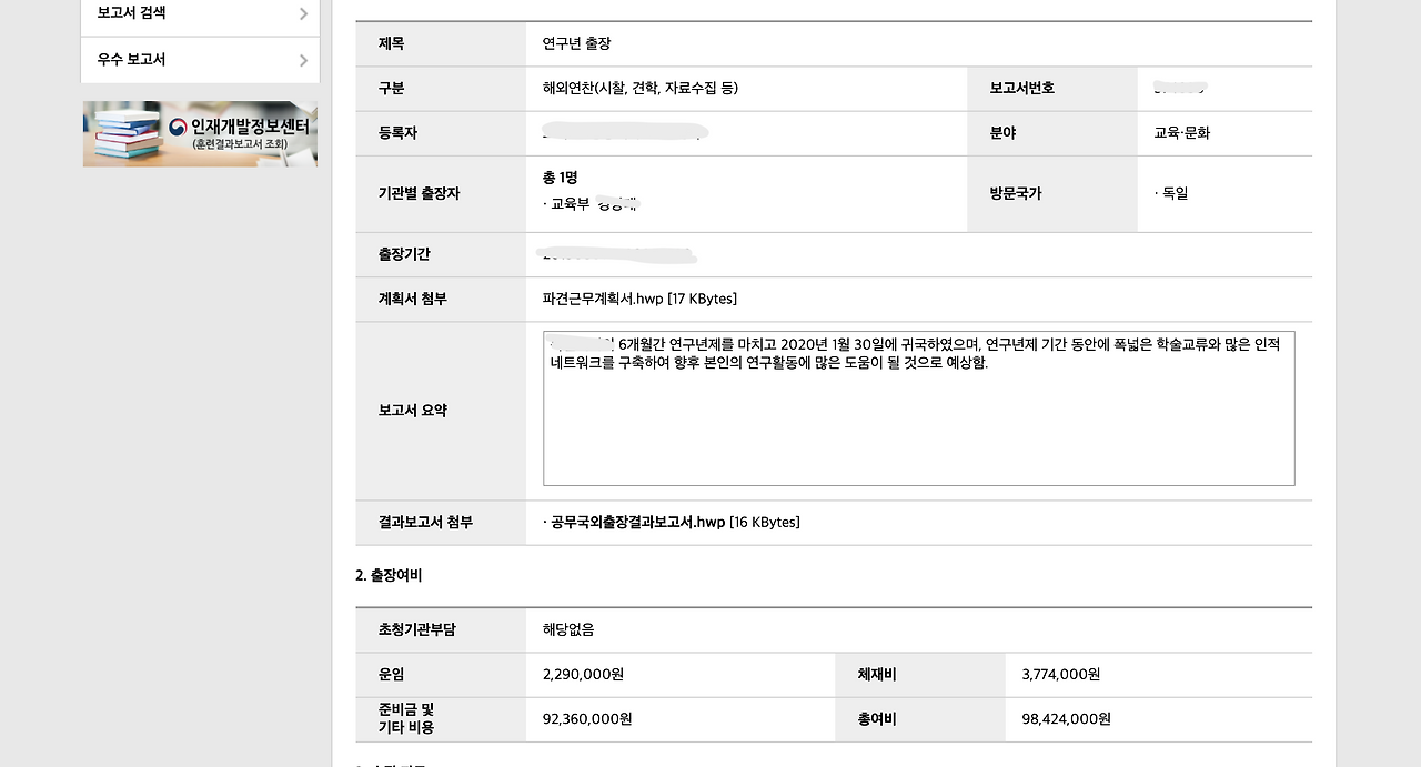 그런데 이걸 등록하지 않는 것에 대해서 패널티도 없는 것 같고, 내용이 부실해도 패널티가 없고, 누가봐도 놀다왔는데 검토하는 사람도 없고 오타도 있고... 지금 올라온 보고서들 보면 다 작년 재작년에 다녀온걸 이제 올리고 있습니다. 2020년에 이렇게 해외에 많이 나갔다고! 해서 들어가보니 다 몇년전 것들이더라고요.