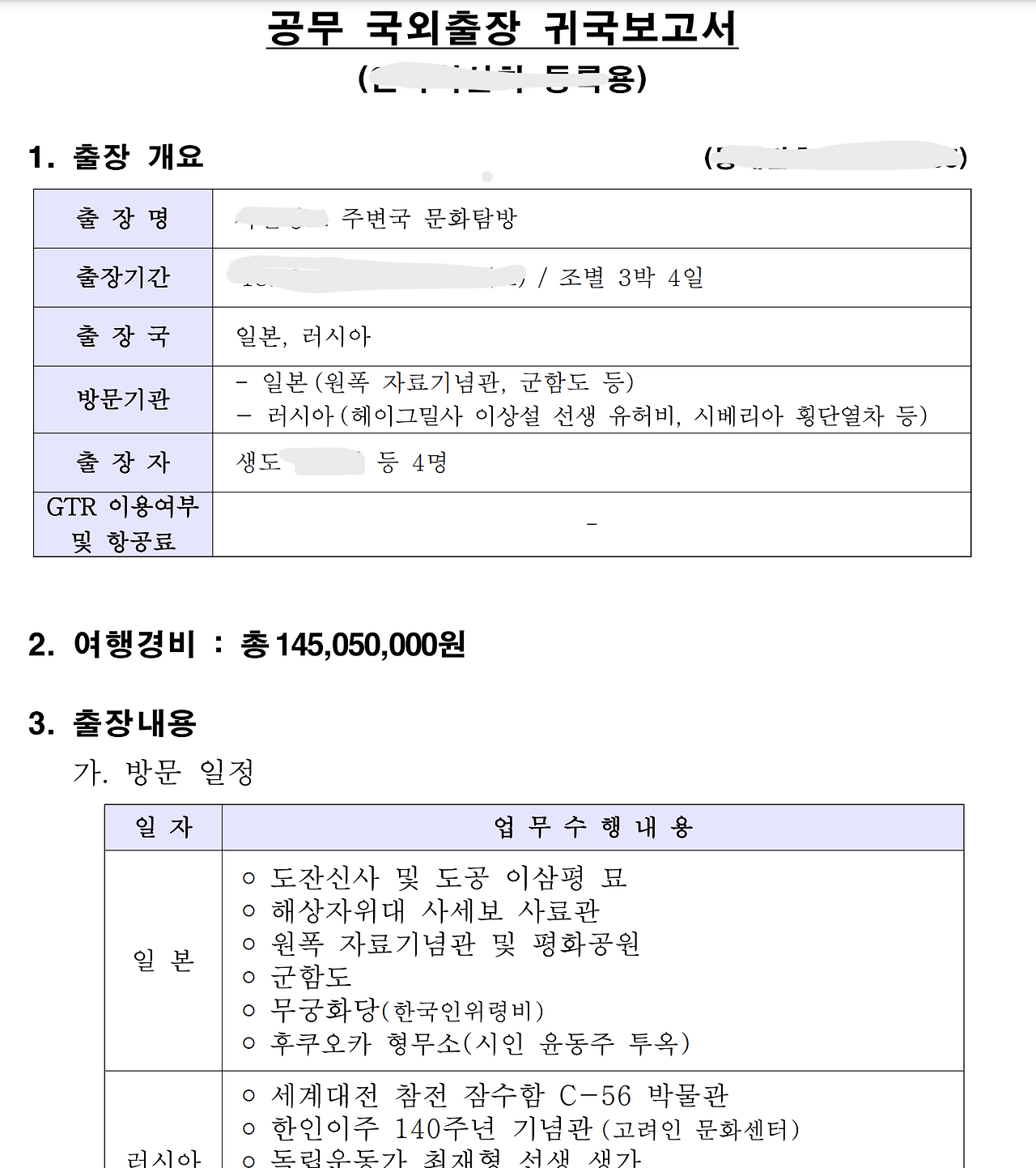 14억을 쓴 보고서가 올라왔는데 보고서엔 4명이라고 되어있습니다. 원랜 146명이 다녀왔나보네요. 일반회사에서 돈 쓰고 이렇게 수치 틀린 보고서 올라오면 관계자 징계먹습니다.