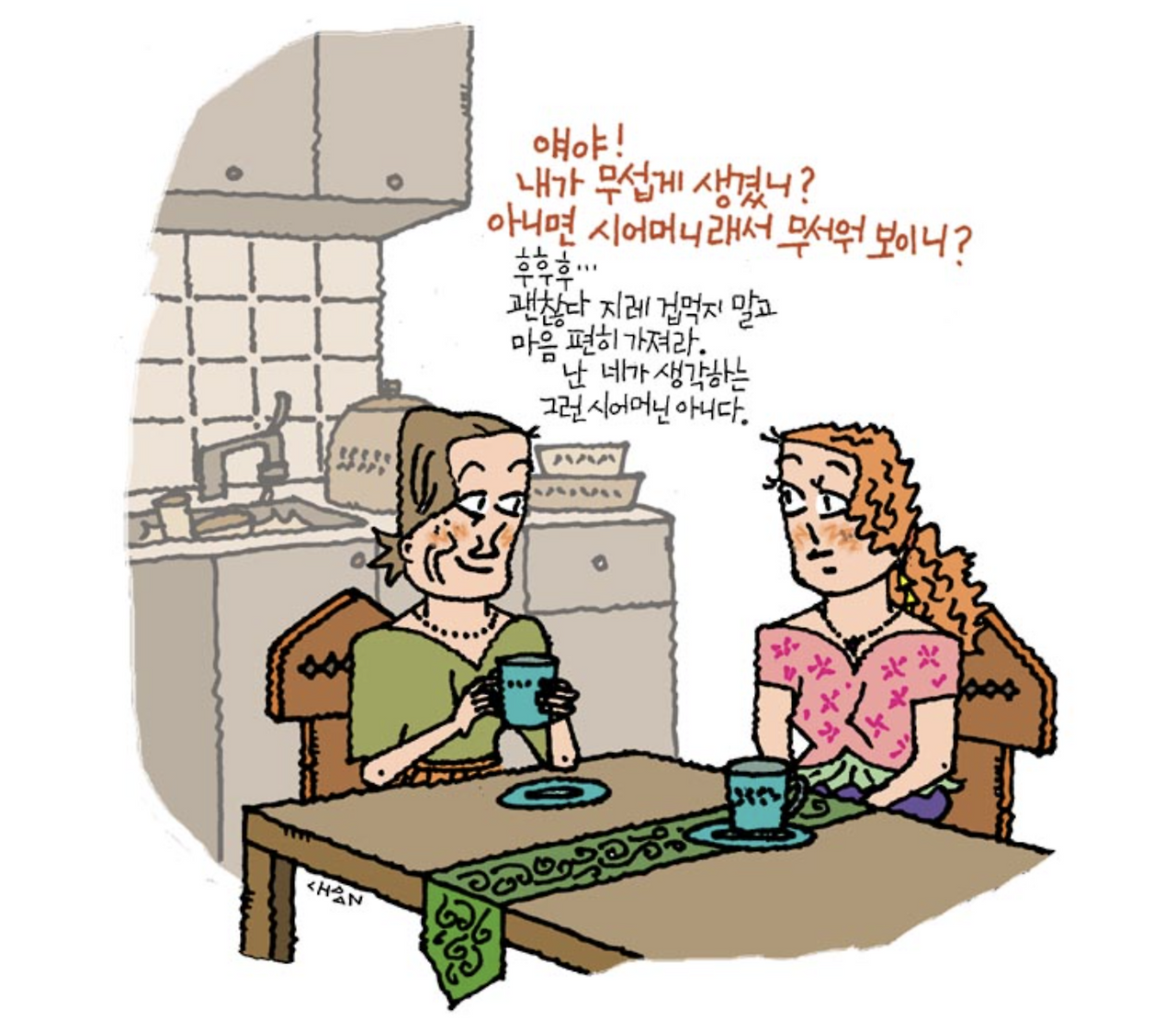 고부관계도 저렇게 서로 예의를 갖추는 사이라면 애초에 고부갈등이라는 단어는 나오지도 않았을 겁니다. 어차피 시부모님과 며느리는 아들을 매개로 연결된 관계라 그 아들이 아니었으면 평생 모르고 살 수도 있는 사람이었으니까요. 부모와 아들 관계가 주종관계나 갑을관계가 아닌데 왜 그 아들과 함께 왔을 뿐인 며느리에게는 갑자기 갑을 관계처럼 그 관계구조도가 변화하는 것인지.