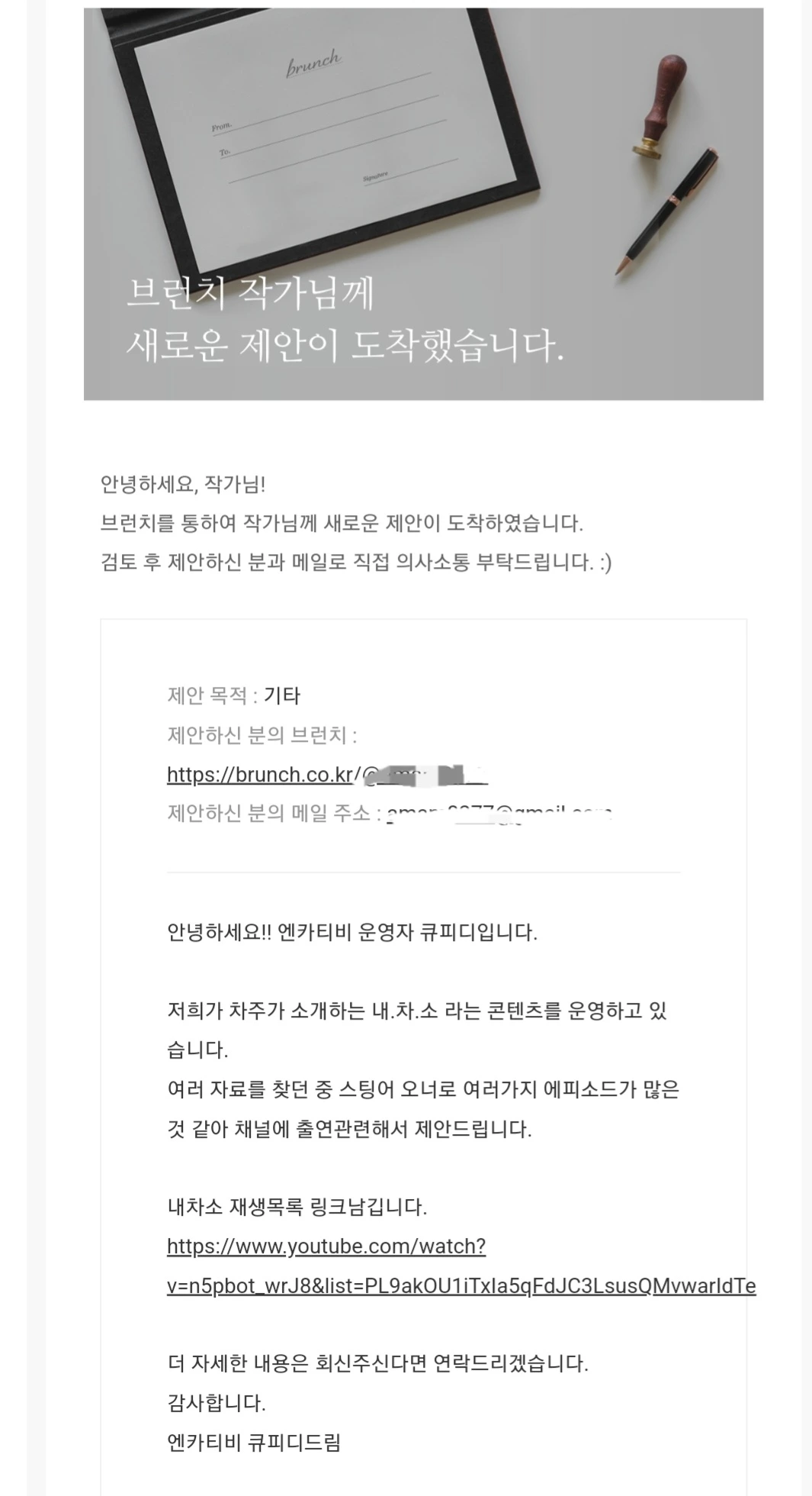 다음 메인에 걸린 글을 보고 스토리가 재밌어보여서 스팅어 이야기를 엔카 '내.차.소.' 채널에 소개해보자며 연락을 주신 것이었다.