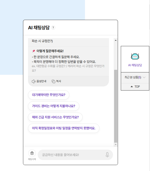 아무리 챗봇의 시대라지만 여러 항목이 묶여 진행되는 여행 상품의 특성상 챗봇으로 처리할 수 있는 부분은 매우 제한적이다. 사이트에 올려놓은 여행 상품 정보로는 대략의 일정, 가격, 일부 출발확정 날짜 정도 밖에 알 수 없다. 티셔츠 한 벌 고르는데는 사이즈와 재질, 가격과 재고여부 정도만 판단하면 되지만 여행은 수많은 것들이 맞아떨어져야 내가 상품을 확정해서 출발할 수 있다. 그래서 챗봇이 아닌 상담 채널이 열려있어야 한다.
