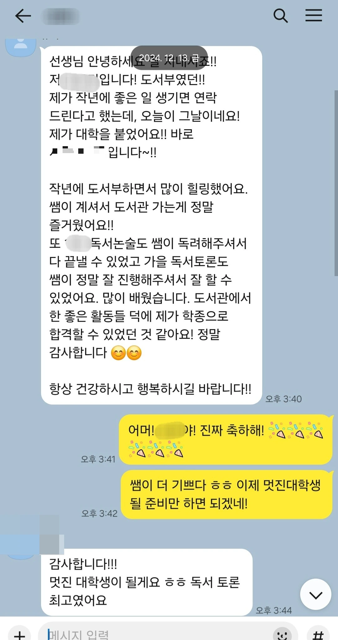 기말고사 기간이라 간만에 조퇴를 하고 집에 와서 소파에 널부러져있는 나를 벌떡 일으켜세운 연락. 도서부였던 00이의 대학 합격소식이었다. 기억난다. '쌤 제가 좋은일 생기면 꼭!연락드릴게요!기다리고 계세요!' 했던 그 표정이.