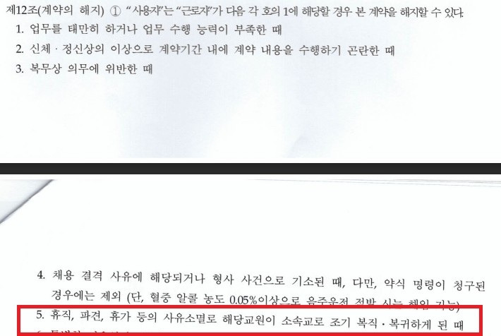 기간제교사의 계약서에는 '사유소멸로 교원이 소속교로 복직하면 계약을 해지한다'는 조항이 꼭 들어가있다. 이 때문에 기가막힌 상황이 벌어진 적도 있다.