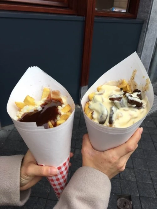 마켓에는 Reitz라는 프리츠 맛집이 있는데 아래 사진처럼 종이 고깔에다가 프리츠를 잔뜩 담아서 준다. 우리가 먹은 건 '스페셜 소스' 인데, 다진 양파, 마요네즈, 그리고 정체를 알 수 없는 검붉은 소스가 섞여있다. 진짜 진짜 맛있는데, 레시피만 알 수 있다면 집에서도 자주 해먹고 싶을 정도다. 오른쪽껀 말고기가 들어간 소스인데 생각보다 고기가 부드러워서 놀랐다. 말고기를 먹어본 적이 없어서 괜히 거부감이 들었는데 나름 괜찮았다. 사실 갓 튀겨져서 나온 따끈따끈한 프리츠는 어떻게 먹든 맛있을 것 같다, 하하!