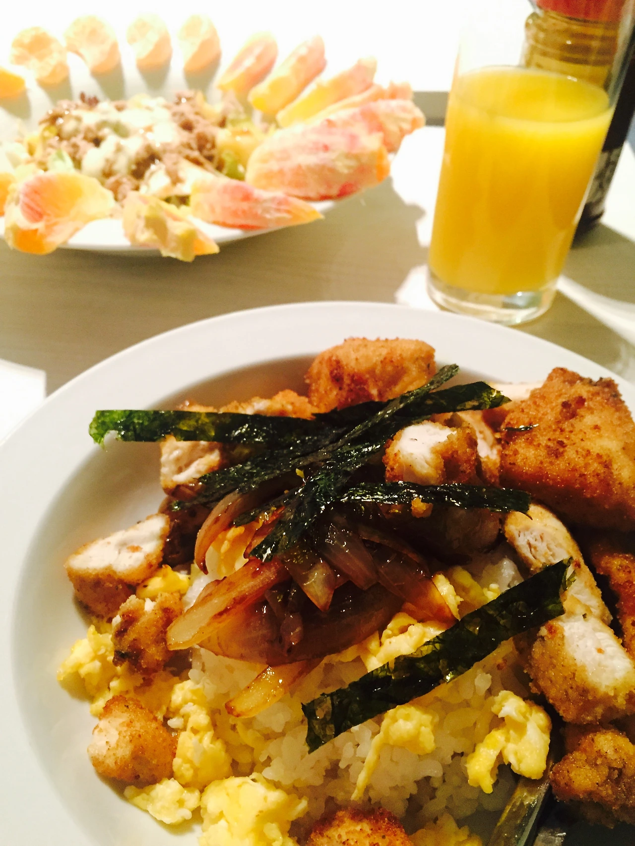치킨을 다 튀기자 미리 안쳐놓은 밥이 다 되었다. 확실히 둘이서 준비를 하면 효율적으로 시간에 맞게 착착 잘 된다. 지은이랑 같이 요리한지도 벌써 한달이 넘어서 그런가. 아무튼 밥 위에다 스크램블 에그를 언고, 위에 졸인 양파와 치킨 자른 것을 올렸다. 마요네즈와 데리야끼 소스를 뿌리고 그 위에 김 자른 것을 뿌리면 완성!