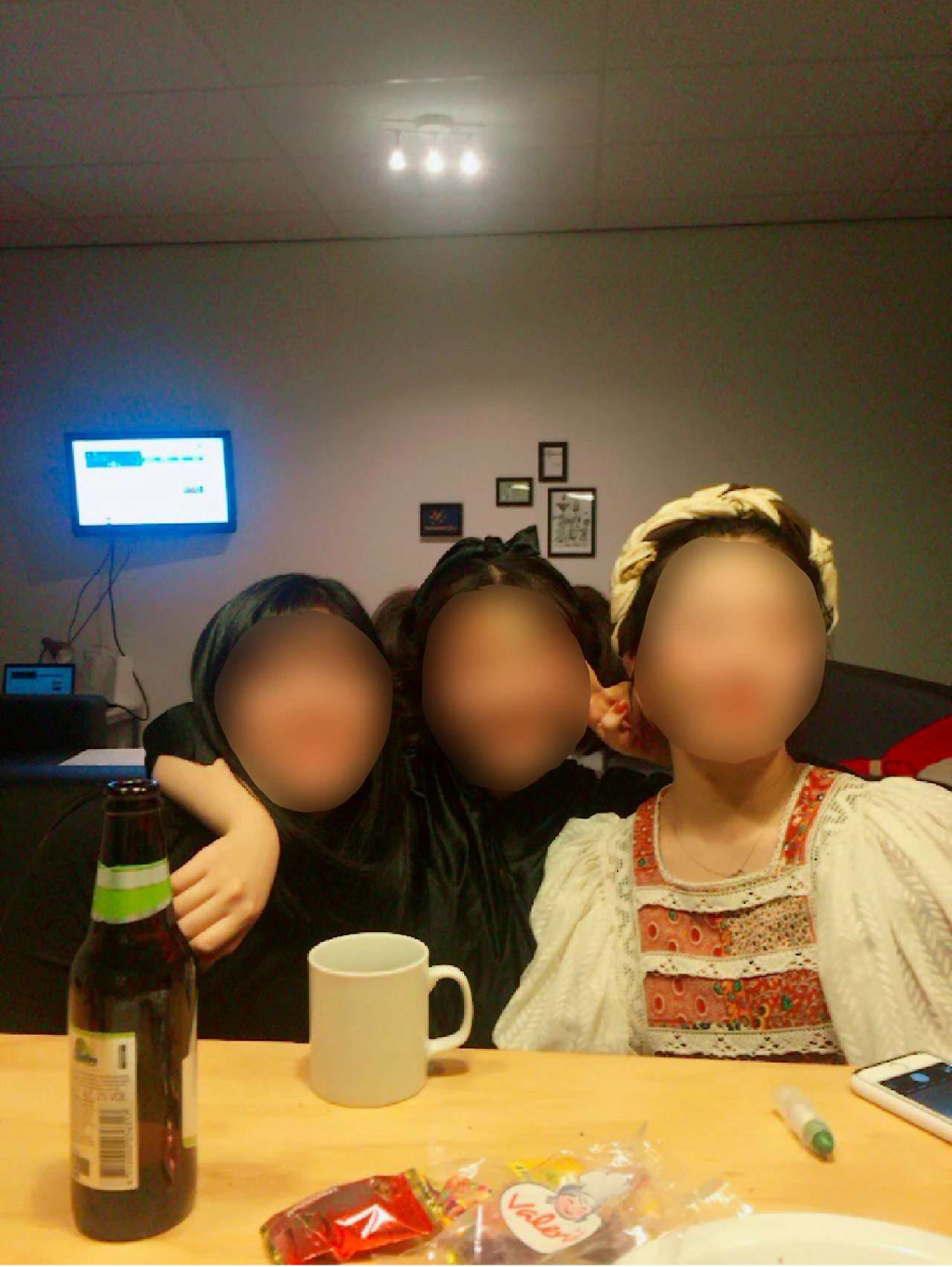 낮동안은 밖에서 퍼레이드를 구경하고, 음식도 사먹고 술도 마시고 하면서 동네를 열심히 돌아다녔다. 이제는 저녁의 파티를 위해 준비할 시간! 우리는 리빙룸에 모여서 저녁을 먹고 수다를 떨며 잠시 휴식을 취했다. 저녁에 나가면 분명 새벽에 들어올 테니까...^^ 물론 궤짝째 사둔 맥주를 열심히 비웠다. 나랑 지은이는 한복을 벗고 좀더 놀기 편한 옷으로 갈아입었다. 윤진이가 페이스페인팅용 크레용을 가져와서(왼쪽 사진 우측 하단에 보면 크레용이 살짝 보인다ㅋㅋㅋㅋㅋ), 사진에는 블러칠해서 보이지 않지만 우리는 얼굴에 이런저런 그림도 그렸다. 아침에 마켓에서 본 사람들에 비하면 우리의 페이스페인팅은 진짜 그냥 소소한 낙서 수준이긴 했지만, 그래도 이것만으로도 기분을 낼 수 있어서 재밌었다. 우리는 카니발 준비랍시고 궤짝째 사두었던 맥주를 후루룩 비워내며 프리드링크를 했다. 다음번에는 엄청 큰 맥주통 모양으로 된 걸 사봐도 좋을 것 같다.
