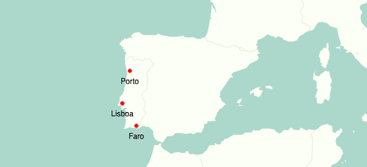사실 이번 여행은 꽤 즉흥적으로 결정되었다. 마스트리히트 사람들이 카니발에 진심인 덕분에 카니발 시즌에는 거의 일주일간의 방학이 주어지는데, 그런 만큼 이 연휴 기간을 이용해 여행을 가는 사람들도 많은 모양이었다. 우리는 바보같이 카니발 즐길 생각만 하며 무계획하게 있다가 뒤늦게 여행 계획을 짜기 시작했다. 그러다 보니 항공권을 급하게 예매해야 해서 선택지가 별로 없었다. 보통 포르투갈 하면 리스본이나 포르투를 많이 떠올릴 텐데, 여행 날짜에 임박해서 우리가 끊을 수 있었던 티켓은 아인트호벤에서 파루(Faro)라는, 포르투갈 남쪽의 작은 도시로 가는 항공권 뿐이었다. 결국 아래 지도에 표시한 것처럼 파루→리스본→포르투로 이어지는 루트로 계획을 짜게 되었다. 사실상 이번 여행은 포르투갈 종단 여행이라고 해도 과언이 아니다.