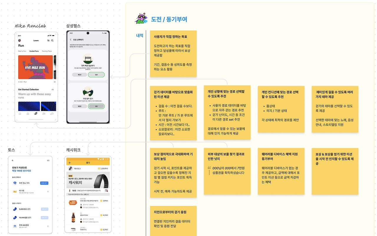 걷기 서비스는 현재 다양한 도메인에서 적용하고 있었는데 걷기가 메인 테스크이고 부가적인 요소(쇼핑, 광고)가 붙어 운영되는 서비스가 있었고(ex. 캐시워크), 헬스케어 앱 중 한 요소로 운영되고 있는 서비스가 있었고(ex. 삼성헬스), 운동과 관련 없는 도메인이지만 걷기 서비스를 도입해 앱 사용율을 높이고 있는 서비스가 있었다.(ex. 토스, 네이버)