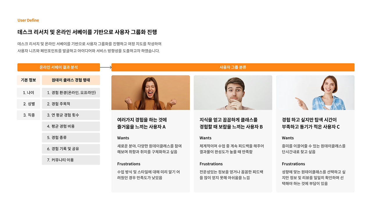 여러 가지 경험을 하는 것에 즐거움을 느끼는 사용자, 지식을 얻고 꼼꼼하게 클래스를 경험할 때 보람을 느끼는 사용자, 경험하고 싶지만 탐색 시간이 부족하고 동기가 적은 사용자로 구분하였다.