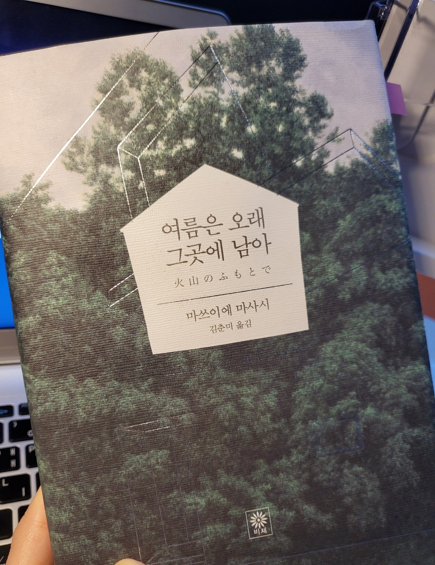 "잎사귀 스치는 소리와 매미, 벌레, 새소리가 한데 섞여 머리 위에서 쏟아져 내린다. 풀과 잎사귀 냄새를 머금은 약한 바람. 올려다보니 주변보다 훨씬 밝은 파란 하늘이 나무 사이로 보인다"