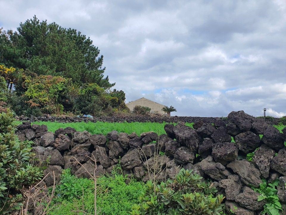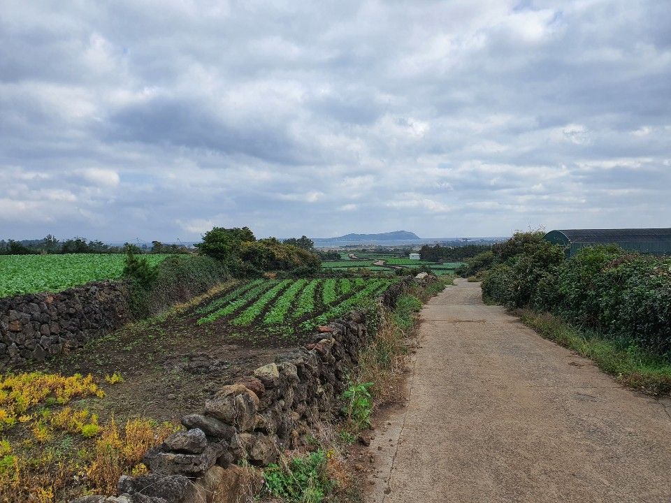 오름에서 내려와 보이는 밭과 하늘