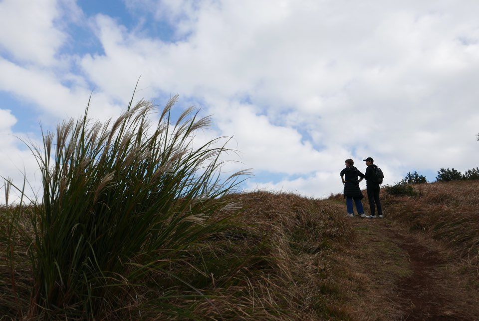 말미오름을 오르고 내리는 순간 바로 알오름이 이어진다. 오름이라지만 둘 다 유치원 친구들도 쉽게 오를 수 있는 가파름이고 억새 밭 속에서 오르는 오름길은 하늘로 오르는 천국의 계단이다.