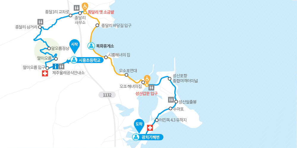 올레 1코스는 오름과 바다가 이어지는 길이다. 푸른들 사이에 우뚝 솟은 말미오름과 알오름을 차례로 오르고 성산일출봉과 우도를 바라보며 걷는 바닷길이다. 1코스는 산과 바다를 모두 느낄 수 있는 최고의 코스라 생각이 든다.