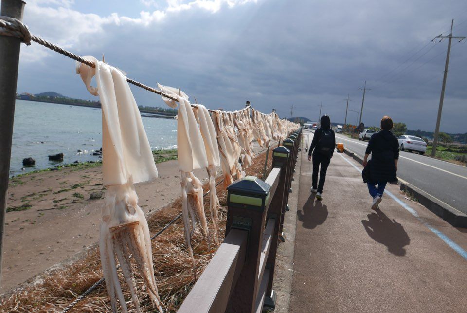 그냥 지나칠 수가 없다. 지나가는 모두가 오징어 한 마리와 우도 막걸리를 한잔씩 하나보다. 나도 먹어보기로 했다. 역시 맛나다.