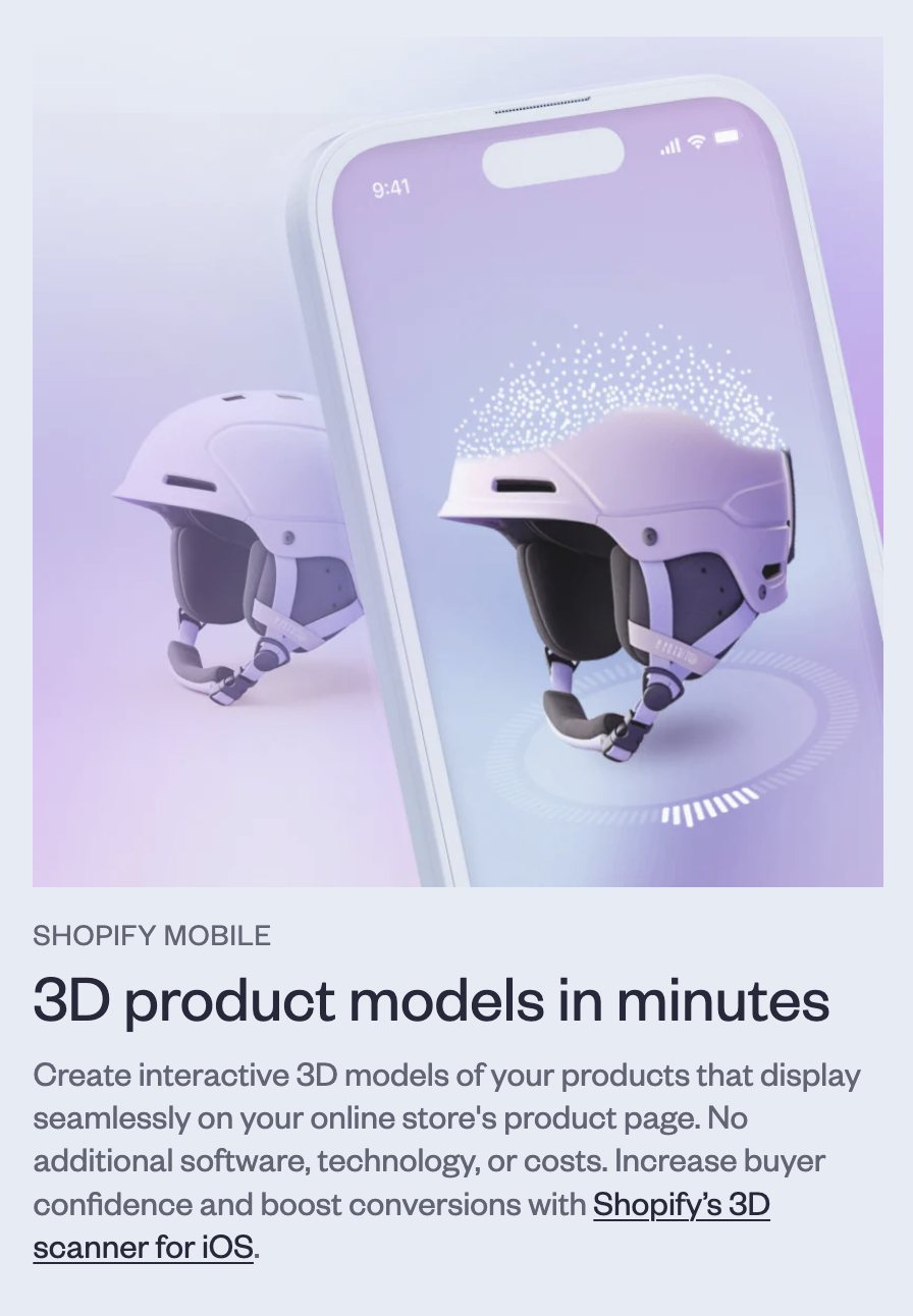 우선은 우리에게 익숙한 생성형 AI를 활용한 기술들이 눈에 띄었습니다. 대표적으로 Shopify's 3D Scanner 앱이 있습니다. 온라인 사이트에서 2D의 단면이 아닌, 3D로 제품의 이미지를 생성하도록 제공합니다. 또한 AI-powered shopping assistant처럼 쇼핑몰 사이트 내에서 구매 고객의 쇼핑을 지원하는 서비스에도 이런 생성형 AI 기술이 활용되었습니다.