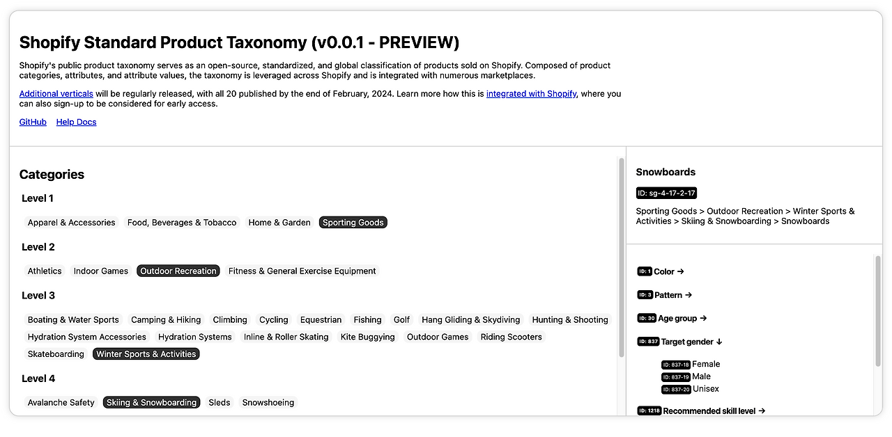 하지만 더욱 놀라운 것은 쇼피파이는 제품 분류체계(Product Taxonomy)를 개발하고 이를 오픈소스로 제공한다는 점입니다. 검색과정에서 발생할 수 있는 검색결과의 오차를 최소화하기 위해서, 메타데이터를 구축하는 것입니다.