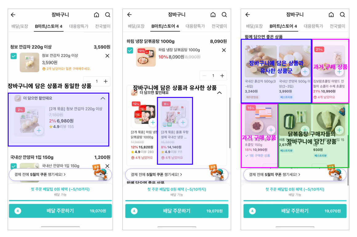 특히, 통크나 빵류 등 주전부리 상품이나 어느 요리에 넣어도 그럭저럭 활용할 수 있는 버섯, 콩나물 등을 추천한 점이 흥미로웠습니다. 마치 오프라인 매장에서 계산대 앞에 있는 껌과 젤리 같았습니다. 결제 직전 저렴하지만, 부담 없는 상품을 노출시켜 소비를 자극한 것이 유사한 느낌입니다.