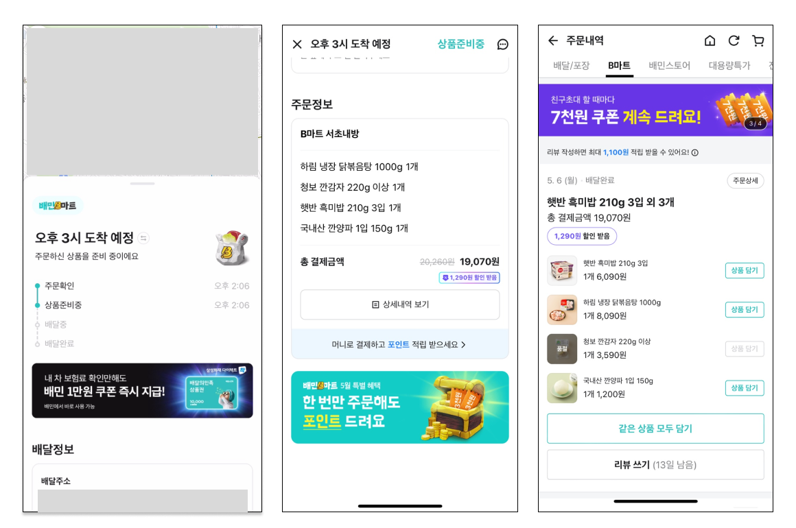 반면 B마트는 주문완료 후, 1-2시간 이내의 멀지 않은 미래에 배달이 시작됩니다. 상품 준비 중부터 배달 현황이 실시간으로 제공되기 때문에, 재료를 빨리 받아야 하는 고객들은 이 페이지에 오래 체류할 수밖에 없습니다. 배달의민족은 이런 특징을 살려서, 해당 영역에서 광고 상품을 제공하거나 혹은 포인트를 주는 방식 등으로 이미 구매한 유저들을 대상으로 CRM을 진행하고 있습니다.
