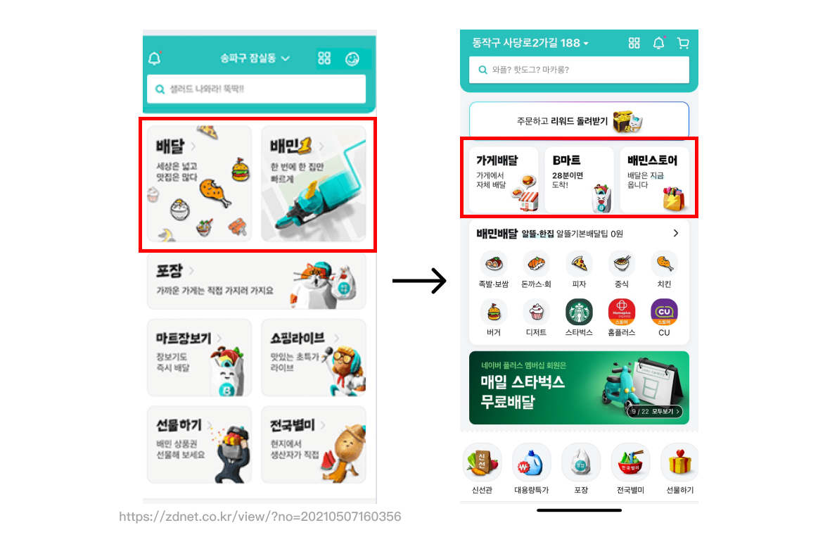 그런 점에서 배달의민족은 프로덕트에서 이런 부분이 잘 드러납니다. 과거 쿠팡이츠의 등장으로 단건 배달을 놓고 경쟁하는 시기에는 일반 배달과 함께 단건 배달인 배민1을 홈에서 강조해서 제공했습니다. 이후 배민이 커머스를 강화하는 방향으로 움직일 때, 프로덕트 홈 화면에서는 B마트(1PL)와 배민스토어(3PL)를 동일한 수준으로 강조했습니다.
