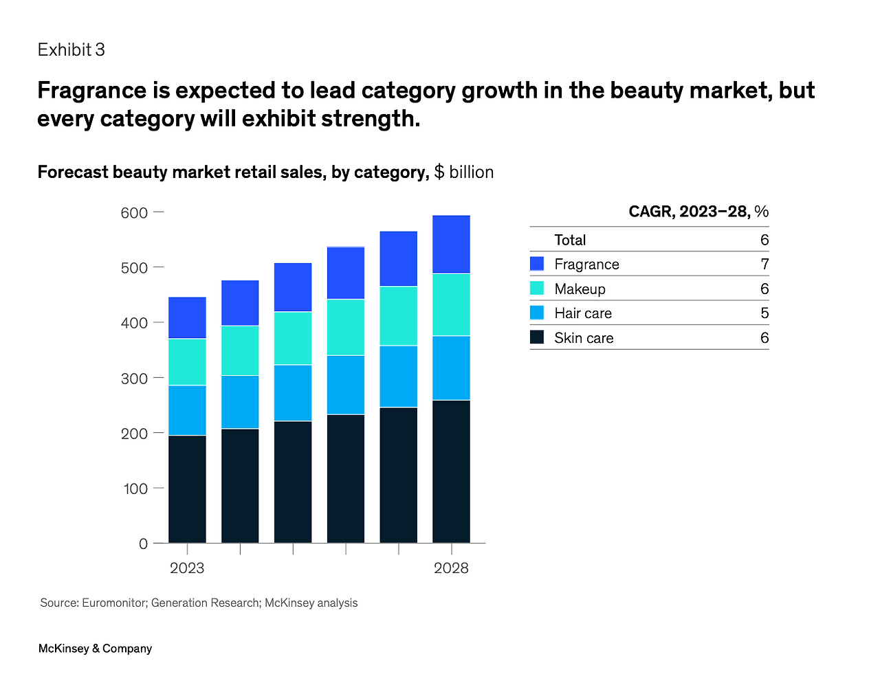 우선 글로벌 뷰티시장은 지속적으로 성장할 것으로 기대됩니다. Mckinsey 리포트를 보면, 글로벌 뷰티 시장의 CAGR(연평균 성장률)은 6%이며, 코스맥스의 법인이 있는 미국과 중국 모두 6% 정도 성장할 것으로 기대됩니다. 코스맥스의 주력 분야인 기초화장품과 색조화장품의 카테고리 모두 6% 성장한다고 볼 때, 코스맥스가 포함된 시장은 6% 정도 성장할 것으로 봐도 무방할 것 같습니다. (가설 1)