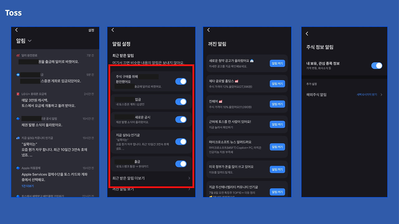 토스는 이 문제를 매우 세련된 방식으로 해결했습니다. 알림을 단순한 목록이 아니라, ‘최근 내가 실제로 받은 메시지’를 기반으로 관리할 수 있도록 구성한 것입니다. 사용자는 환전 알림, 공시 알림, 입출금 알림처럼 받기 싫은 유형을 직접 확인하고, 그 자리에서 바로 끌 수 있습니다. “이 알림을 끄면 다른 중요한 정보도 놓치지 않을까?”를 고민할 필요가 없습니다. 즉각적이고 직관적인 설정 덕분에 사용자는 ‘불필요한 방해를 피하면서도 필요한 정보는 유지한다’는 심리적 통제감을 얻게 됩니다.