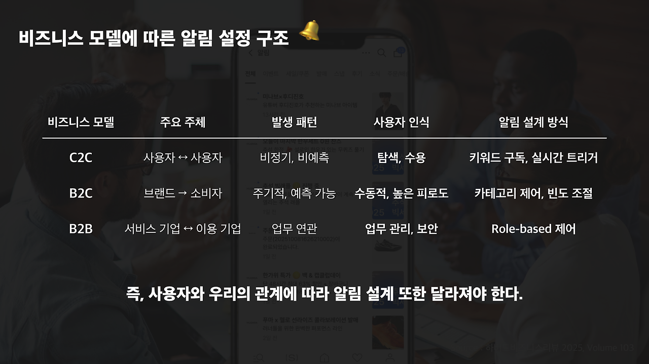 따라서 알림을 설계할 때는, 정보를 생성하고, 발송하는 주체와 사용자의 관계는 먼저 이해해야합니다. 그 관계 속에서 사용자가 불필요한 피로도를 느끼지 않으면서도 필요한 소통이 이루어질 수 있는 구조를 만들어야 합니다. 이제 이러한 관점에서, 비즈니스 모델에 따라 알림 설정 구조가 어떻게 달라지는지 더 구체적으로 살펴보겠습니다.