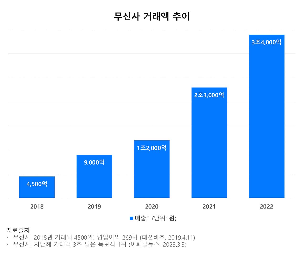 무신사의 거래액이 백화점 매출을 제쳤습니다. 작년 2022년 기준 무신사의 연간 거래액은 3조원 규모로, 백화점 중 매출규모가 가장 큰 ‘신세계 강남점’의 매출액 2조 8400억원보다 높은 수준으로 집계되었습니다. (참고: 'MZ 놀이터' 무신사, '백화점 1·2위' 신세계 강남·롯데 잠실 제쳤다)