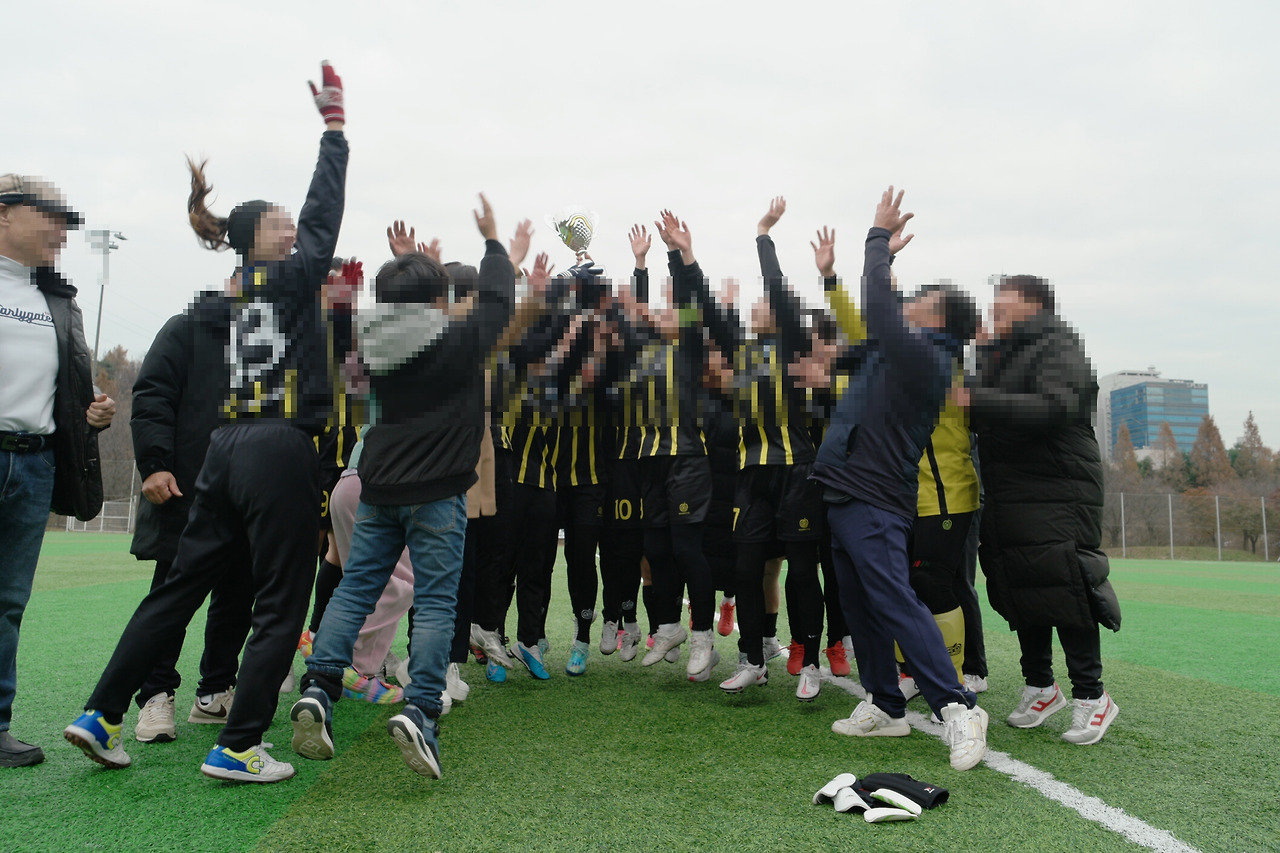 우승이 확정된 순간이었다. 다들 소리를 지르면서 골키퍼 쪽으로 얼싸안고 소리 질렀다. 얼마나 기다렸던 순간인가. 감독님도 돌아가신 아버지에게 우승을 빌었다. 이곳저곳 눈물바다였다. 감독님은 지금껏 이 팀을 맡으면서 당했던 설욕을 풀었다고 했다. 경기에 많이 뛰어 피를 뽑으러 한의원을 다녀온 동생, 다리에 쥐가 나 응급실에 실려 간 언니, 무릎 수술을 하고도 앉아있던 골키퍼 언니, 이제는 더 이상 경기를 뛰지 못하지만 팀의 모든 살림을 책임져 주는 코치님, 경기에 뛰지 못할 것을 알면서도 먹을거리 챙겨주던 언니들, 아이들을 맡아준 각자 집의 남편들, 교체선수 체크하면서 감독님 옆에서 명단 작성을 도맡아 하던 동생, 응원 단장을 자처해서 확성기처럼 응원하던 동생, 늦게라도 아이들을 데리고 와서 사진과 영상을 찍어 올려주는 언니 등등 하나하나 누가 시키지 않아도 조용하게 각자의 역할을 했다. 돋빠천사들, 전사들 모두 하나가 되어 우승 트로피를 들어 올렸다.