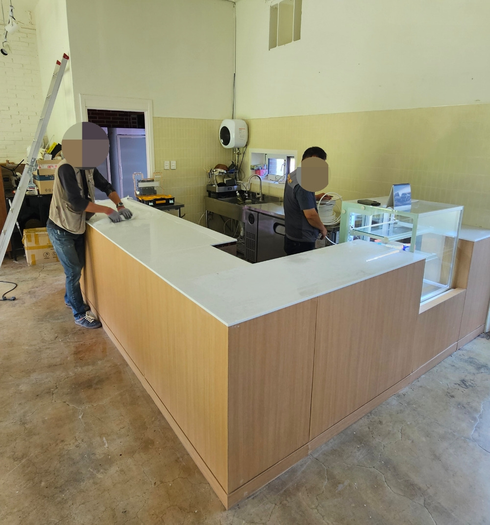 바(bar)를 재구성하는 것도 꽤 힘들었다. 기존의 바를 해체하고, 마감재를 떼어낸 후 재단하여 사용하기로 했다(비용 절감 이슈). 형태를 완전히 새롭게 만들고 바닥 배관 공사도 다시 했다. 그리고 상판과 인테리어 필름은 비용을 들여 마무리했다.