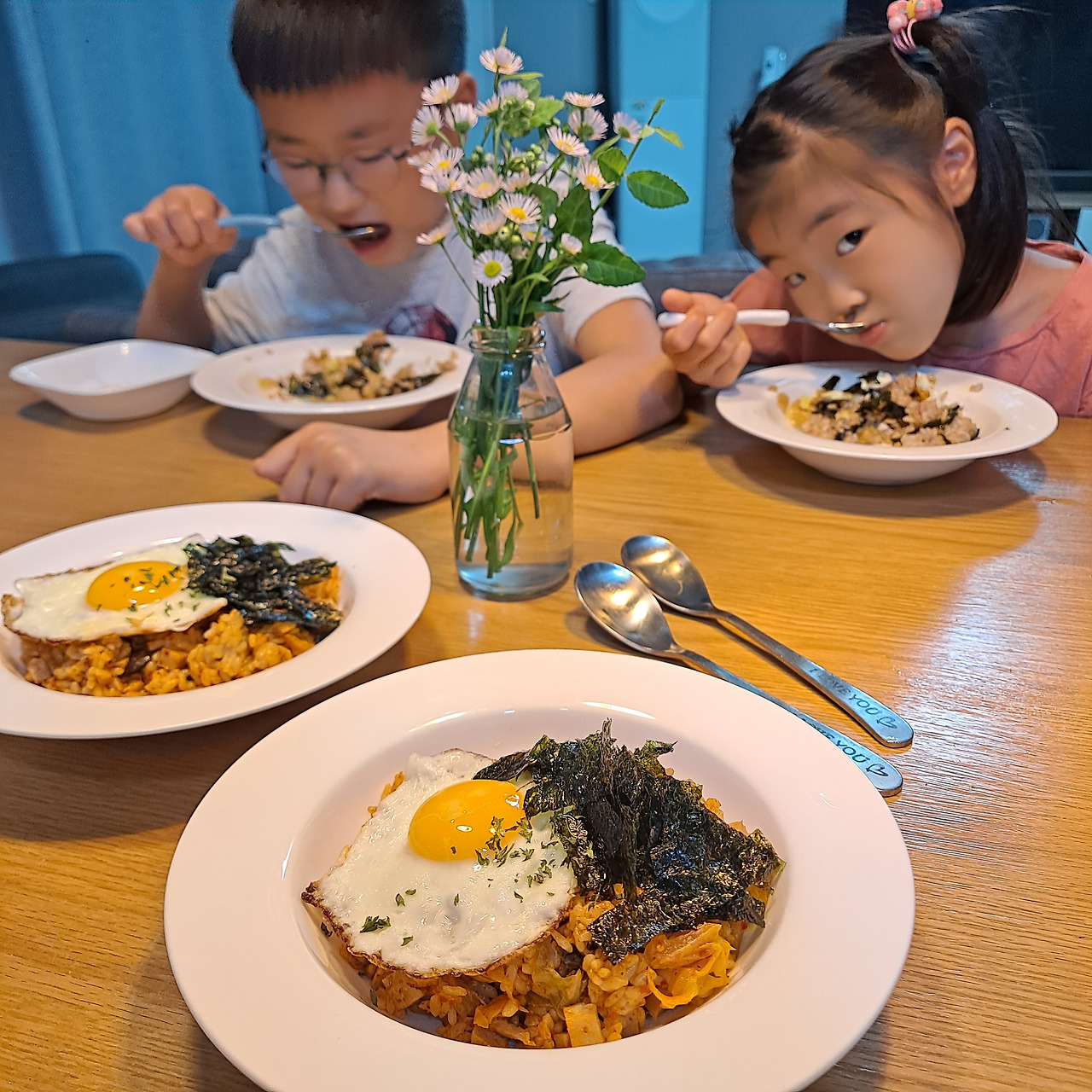 계란은 중 약불에 천천히 반숙으로 익혀주고, 파슬리 가루를 솔솔 뿌려주면 비주얼 완성. 여기에 김가루를 살포시 더하면 이제 서빙 나갈 준비는 완료. 이렇게 뚝딱 저녁 메뉴 김치볶음밥이 완성되었다. 역시나 좋아하는 메뉴 앞에서는 딸아이가 연신 상글벙글하다. 시키지 않아도 손을 씻고 일찌감치 내 옆으로 와서 수저도 놓고, 밥그릇도 서빙한다. 엄마를 도와줘야 빨리 먹을 수 있다는 걸 알기 때문이다.