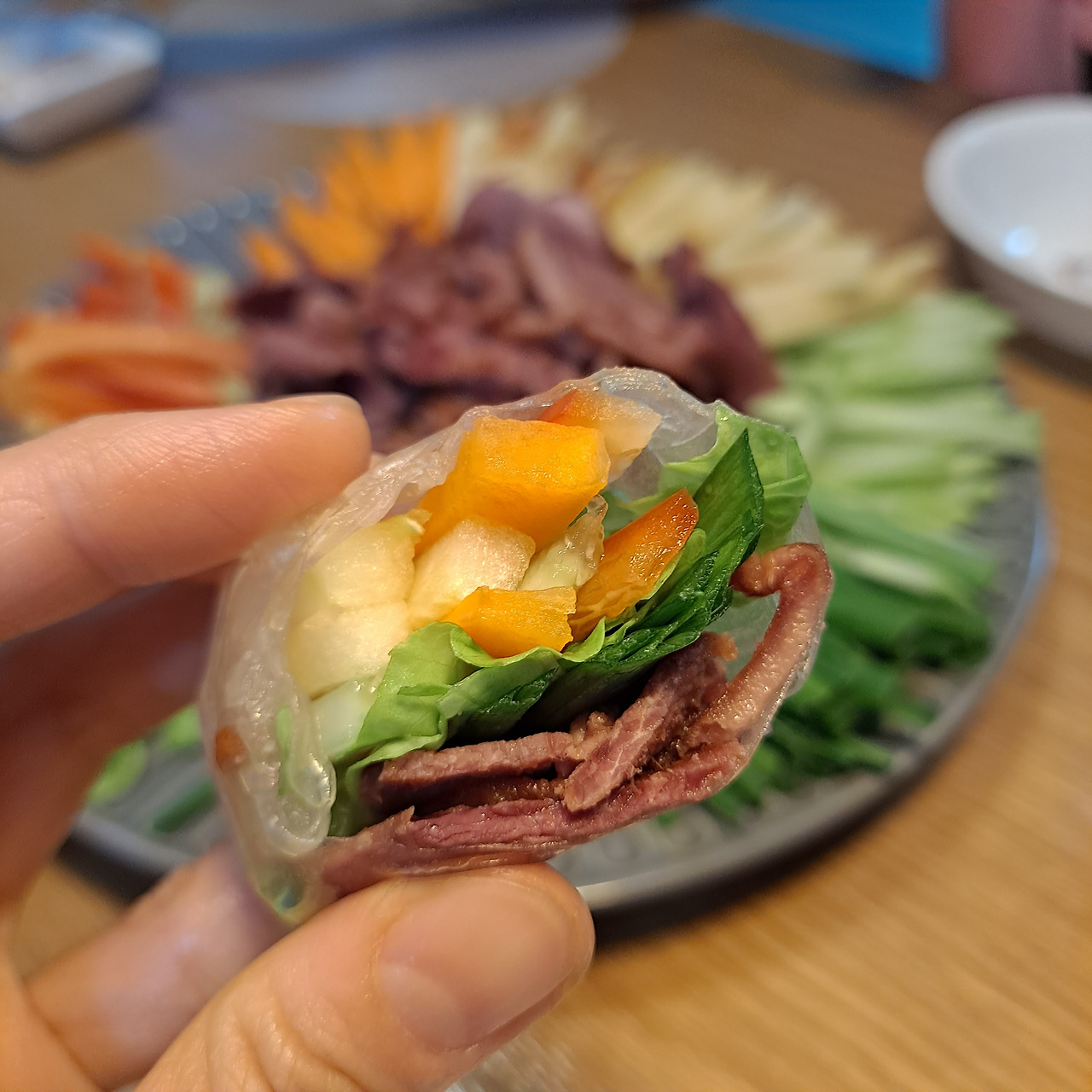 보통 월남쌈에는 파인애플을 넣지만 나는 사과를 선호한다. 맛의 미묘한 차이는 있겠지만 둘 다 단맛과 상큼한 맛을 담당하기에 부족함 없기 때문이다. 무엇보다 사과는 다른 야채들처럼 채 썰 수 있어서 쌈으로 싸 먹기에도 훨씬 편하다. 금액적인 차이도 무시할 수 없다. 이런저런 이유로 우리 집 월남쌈에는 파인애플 대신 사과가 자주 등장한다. 오늘은 사각 모양의 현미 라이스페이퍼도 준비되어 있다. 월남쌈을 자주 먹다 보니, 아예 전용 그릇도 있다.