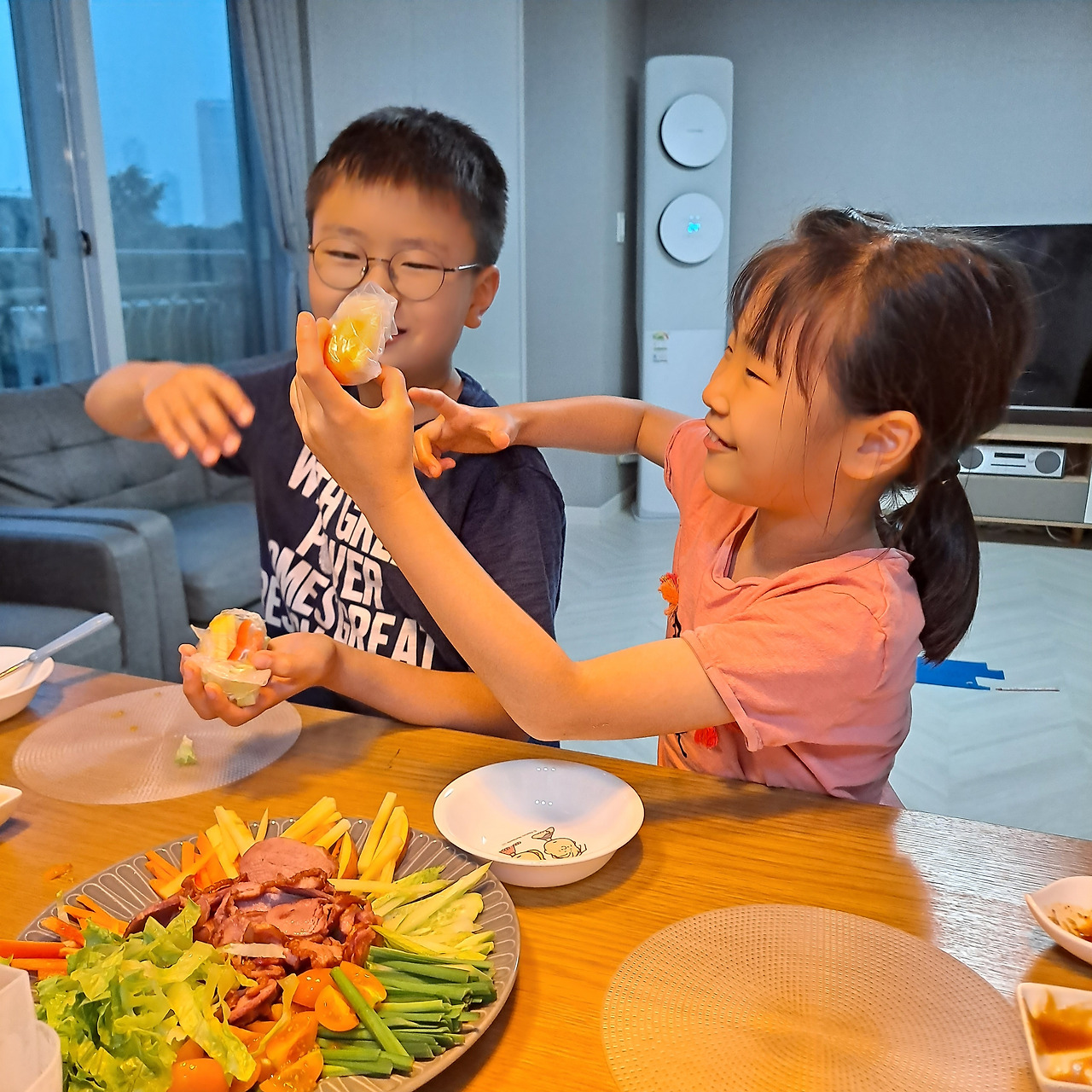 월남쌈의 매력은 아이들에게 거부감 없이 다양한 채소를 먹일 수 있다는 것. 그리고 냉장고에 남은 야채도 빠르게 처분이 가능하다는 점이다. 아이들도 마치 놀이를 하듯, 재료를 하나씩 라이스페이퍼에 올리고 돌돌 말아 모양을 만들며 신이 났다.