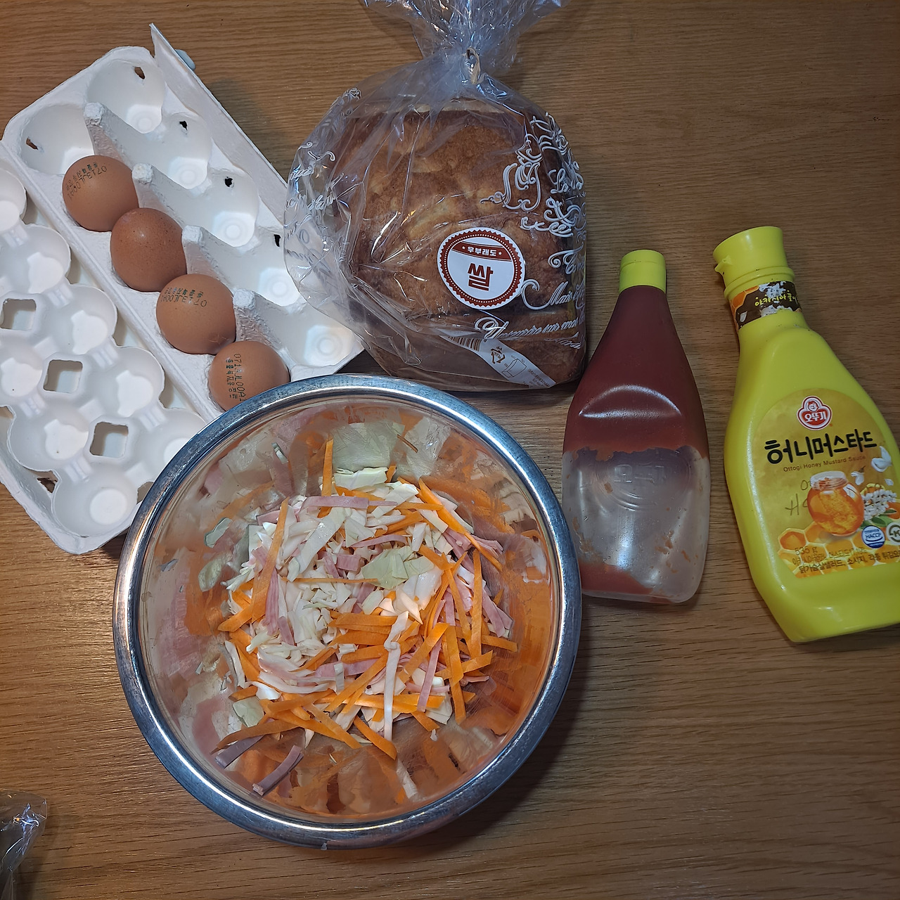 여기에 포인트는 바로 허니머스터드소스! 살짝 톡 쏘는 맛을 추가해야 그 맛이 배가 된다. 그냥 샐러드로 먹어도 좋지만, 샌드위치로 먹게 될 경우 양상추와 같은 야채를 깔아준 후에 케첩과 머스터드를 추가해준다.