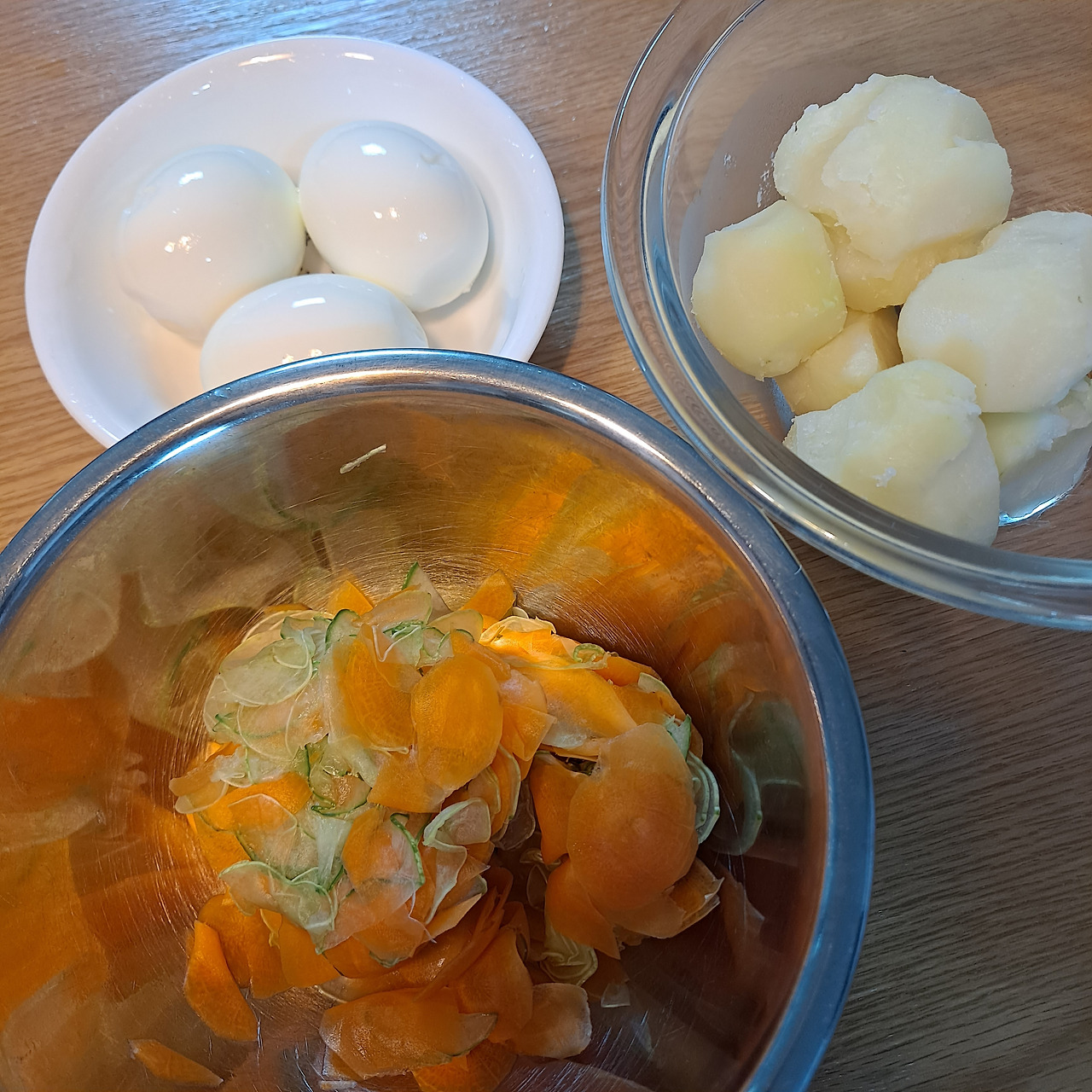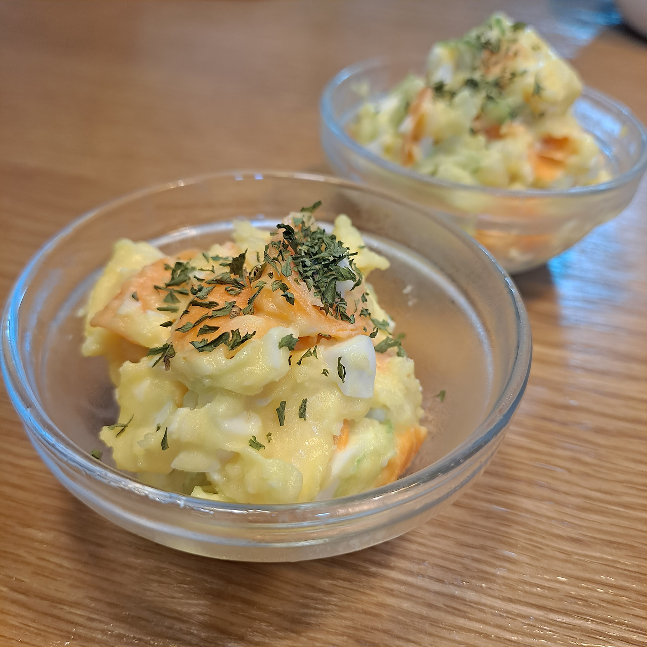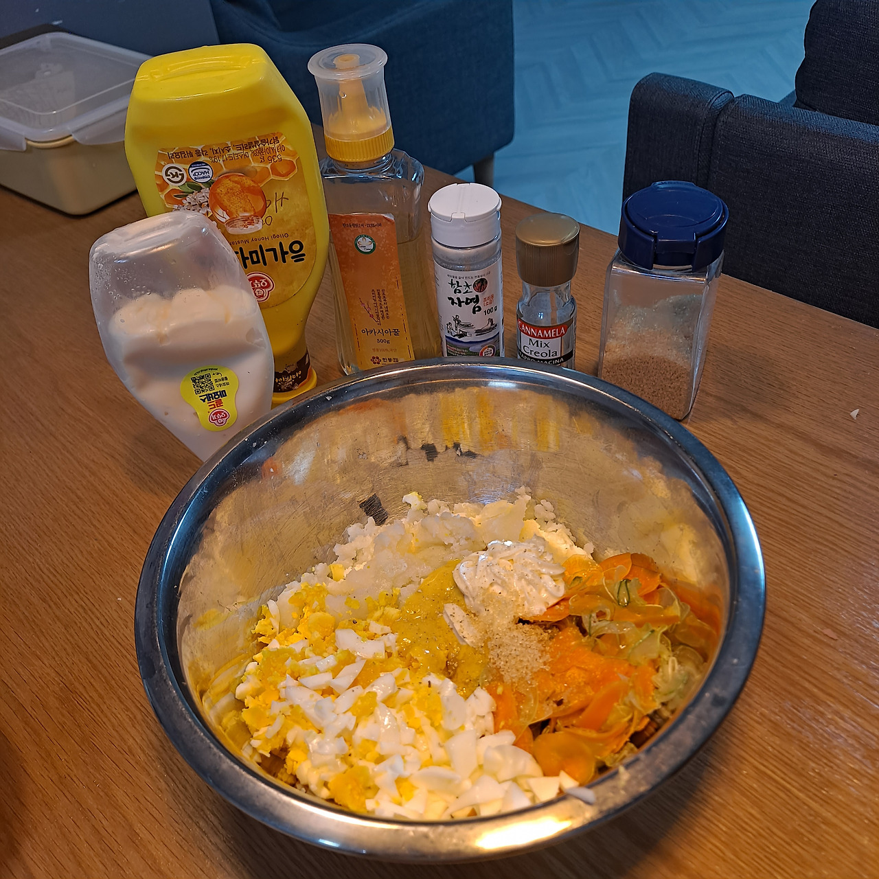 아삭아삭 씹히는 오이와 당근의 식감이 좋은 감자계란 샌드위치는 언제 먹어도 맛있다. 전날 밤 미리 만들어 놓을 수 있어 더욱 아침에 편하게 먹을 수 있는 메뉴이기도 하다. 오이와 당근은 얇게 슬라이스로 썰어 소금에 절여놓은 후 물에 헹궈 물기를 꼭 짠 후 으깬 감자와 삶은 계란과 함께 버무려준다. 마요네즈와 소금 후추도 톡톡 뿌려주고 살짝 단맛도 들어가야 더 맛있다.