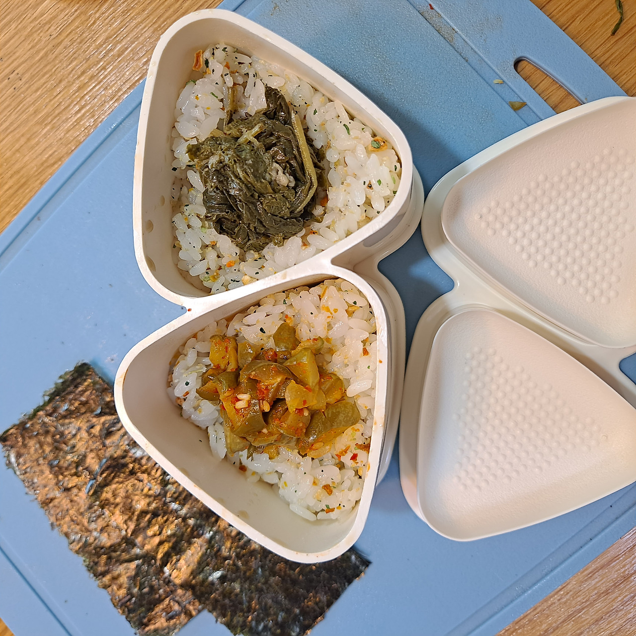 삼각김밥은 틀이 있어야 모양이 잘 잡혀서 좋다. 주먹밥 재료와 참기름, 소금을 밥에 잘 섞어준 후 마무리로 김을 둘러주면 완성. 혹시 밑반찬이 있다면 적절하게 속 재료로 활용할 수 있다. 김치나 오이지와 같은 경우 잘게 다져주고, 나물 종류는 물기를 꽉 짜 준 후 넣어준다. 멸치나 진미채도 잘 어울리는 재료 중 하나이다.