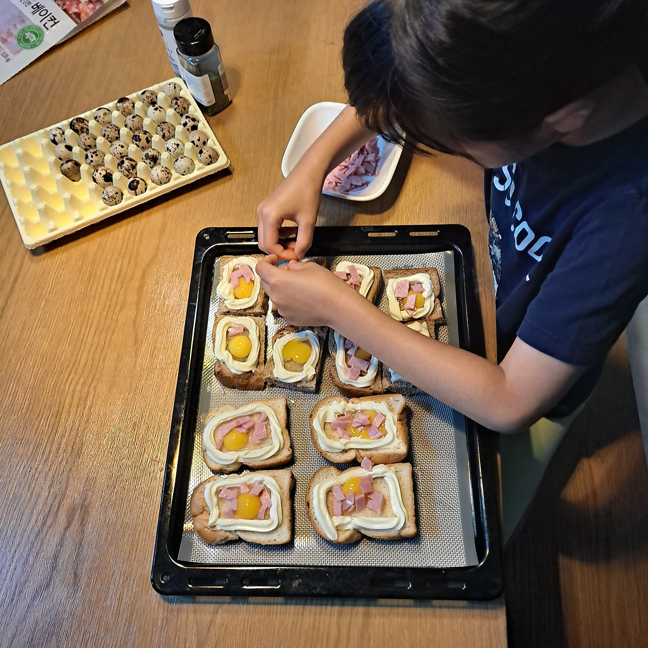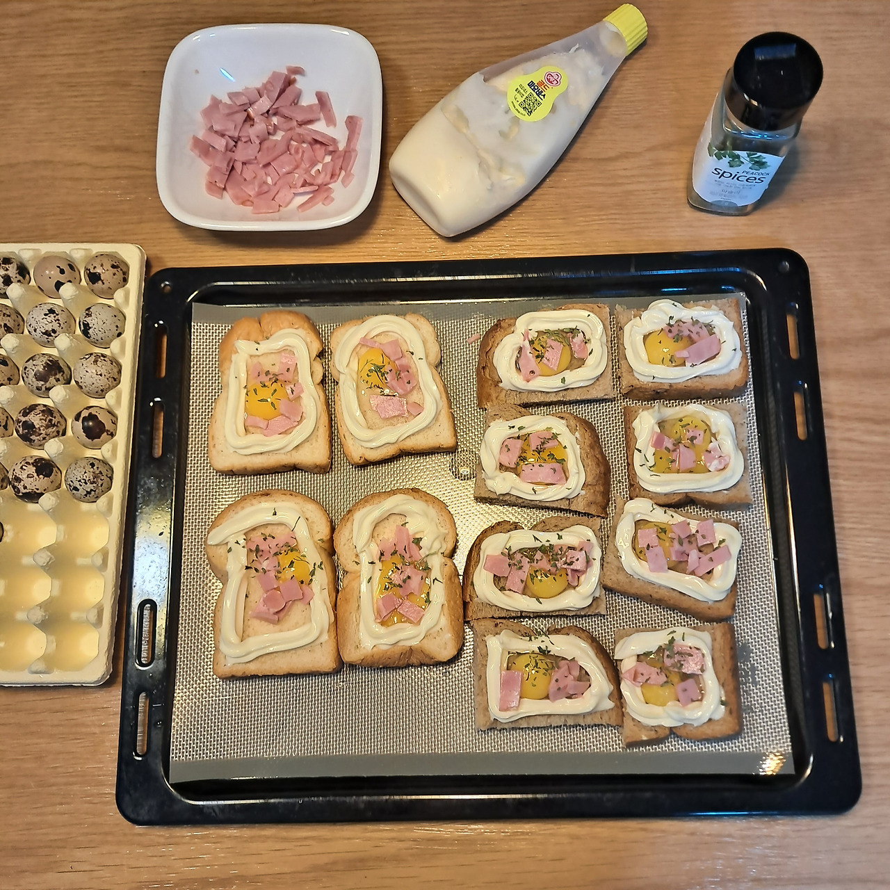 큰 식빵에는 계란으로도 가능하지만, 아이들이 먹기에는 한 입 사이즈인 미니 식빵(혹은 식빵을 4조각으로 잘라서)에 메추리알의 조합이 더 좋다. 마요네즈로 테두리를 만들어 주고 그 안에 메추리알을 톡 깨서 넣어준 후 슬라이스 된 햄 몇 개와 소금 톡톡 그리고 파슬리가루를 뿌려주면 완성이다.