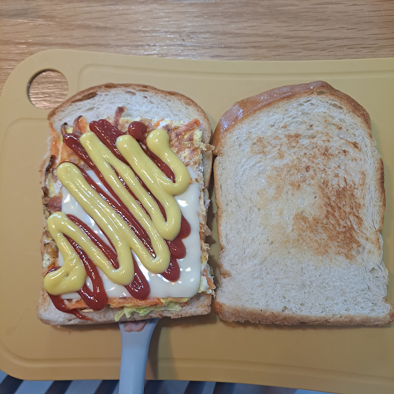 이름만 들어도 코 끝에 버터 혹은 마아가린 냄새가 진동하는 느낌이 드는 길거리토스트. 버터를 두른 팬에 빵을 바삭하게 구워주고 속재료는 양배추, 당근, 햄, 계란을 준비한다. 식빵 모양에 맞게 구워준 후 치즈 한 장 추가해서 빵에 올려주고 케첩과 허니머스터드소스까지 뿌려주면 완성! 취향에 따라 달달한 맛을 선호한다면 설탕을 추가해도 좋다.